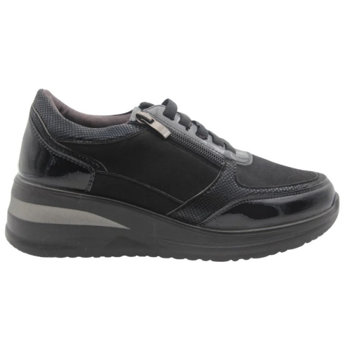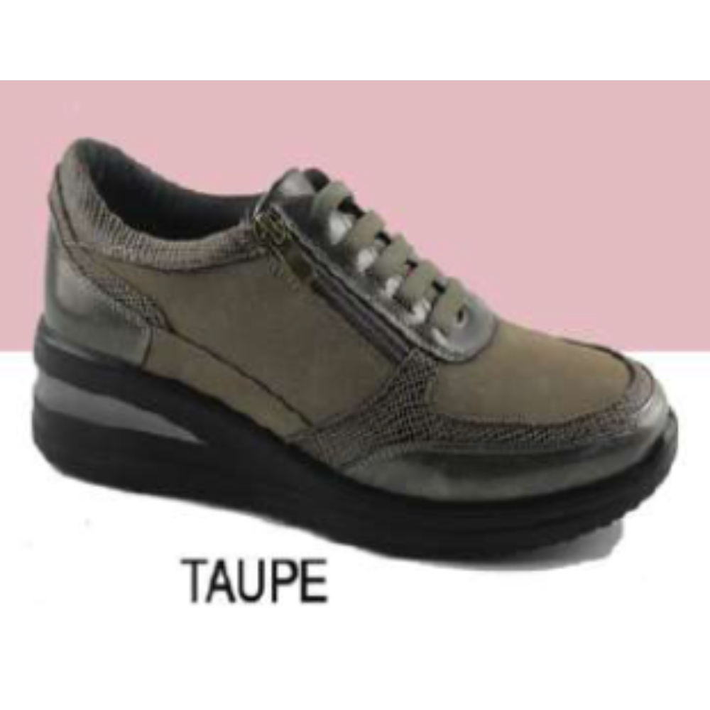 Zapato confort con cremallera lateral y cordones elásticos. Fabricado en material sintético con cuña y una pequeña plataforma que aporta gran comodidad. Color taupe