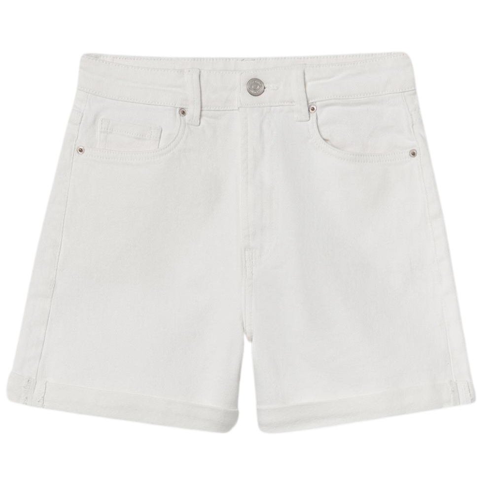Bermuda de tiro alto con cinco bolsillos. Cierre frontal con cremallera y botón metálico. Bajo acabado con vuelta.
