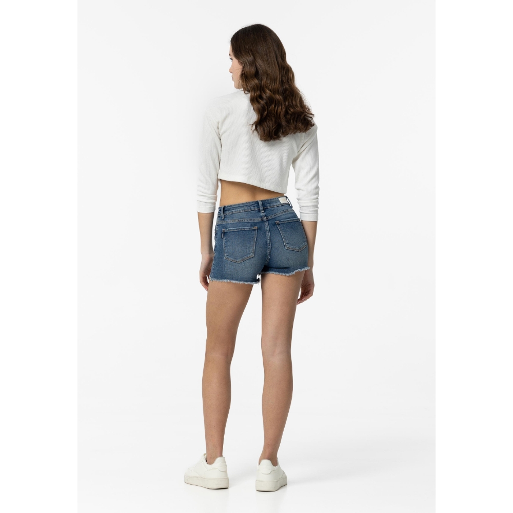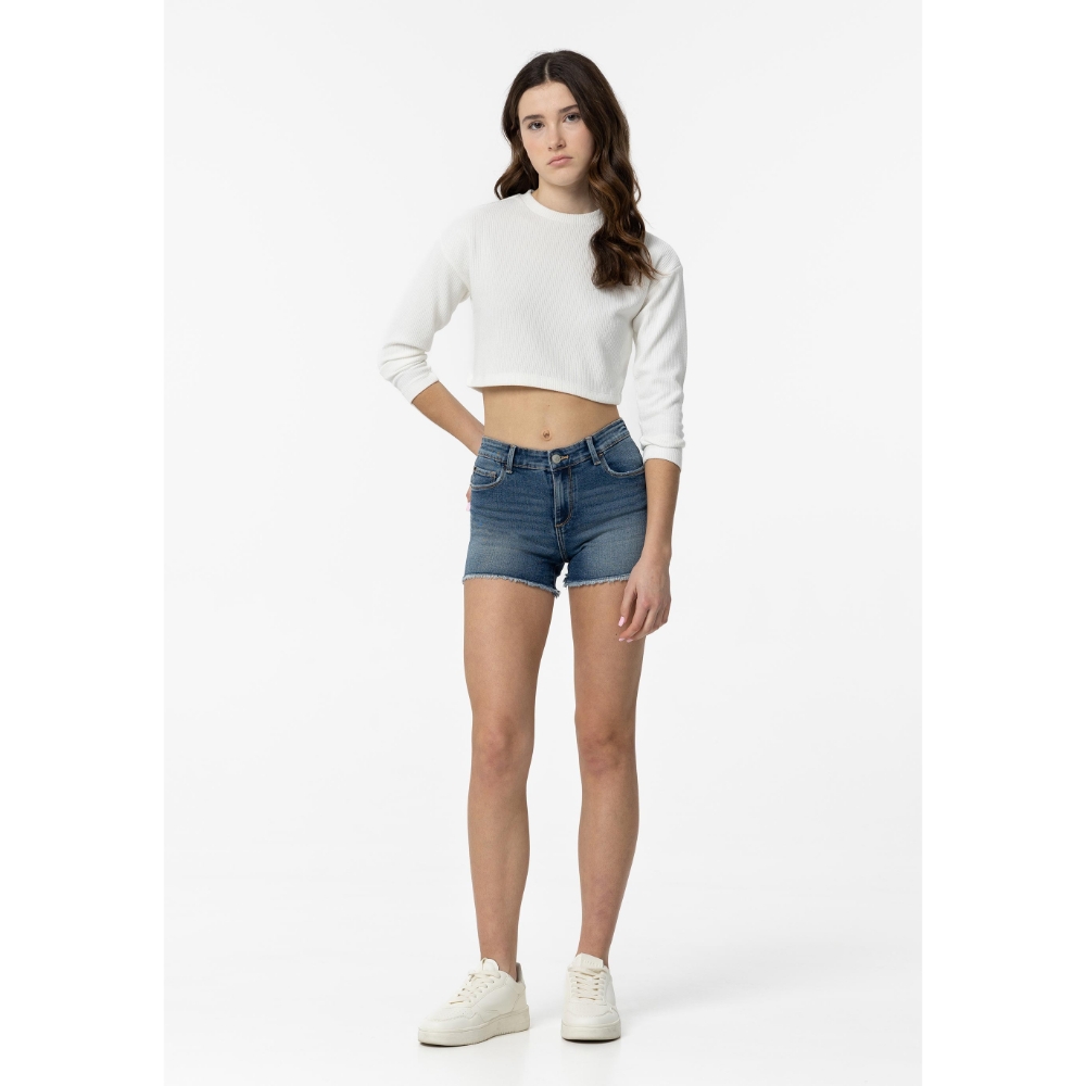 Short de tiro medio con cinco bolsillos. Cierre frontal con cremallera y botón metálico. Bajo con acabado desflecado.