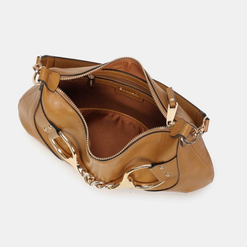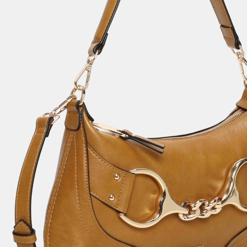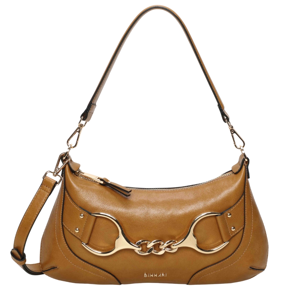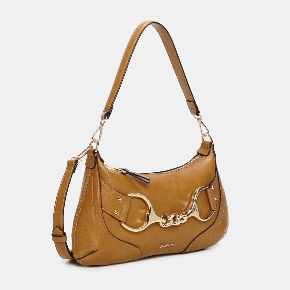 Bolso de hombro pequeño Binnari Lua en color camel. Confeccionado en material sintético de alta calidad. Formato compacto con asa corta y bandolera. Interior organizado con compartimentos. Detalle metálico decorativo. Medidas: 17 x 33 x 1 cm.