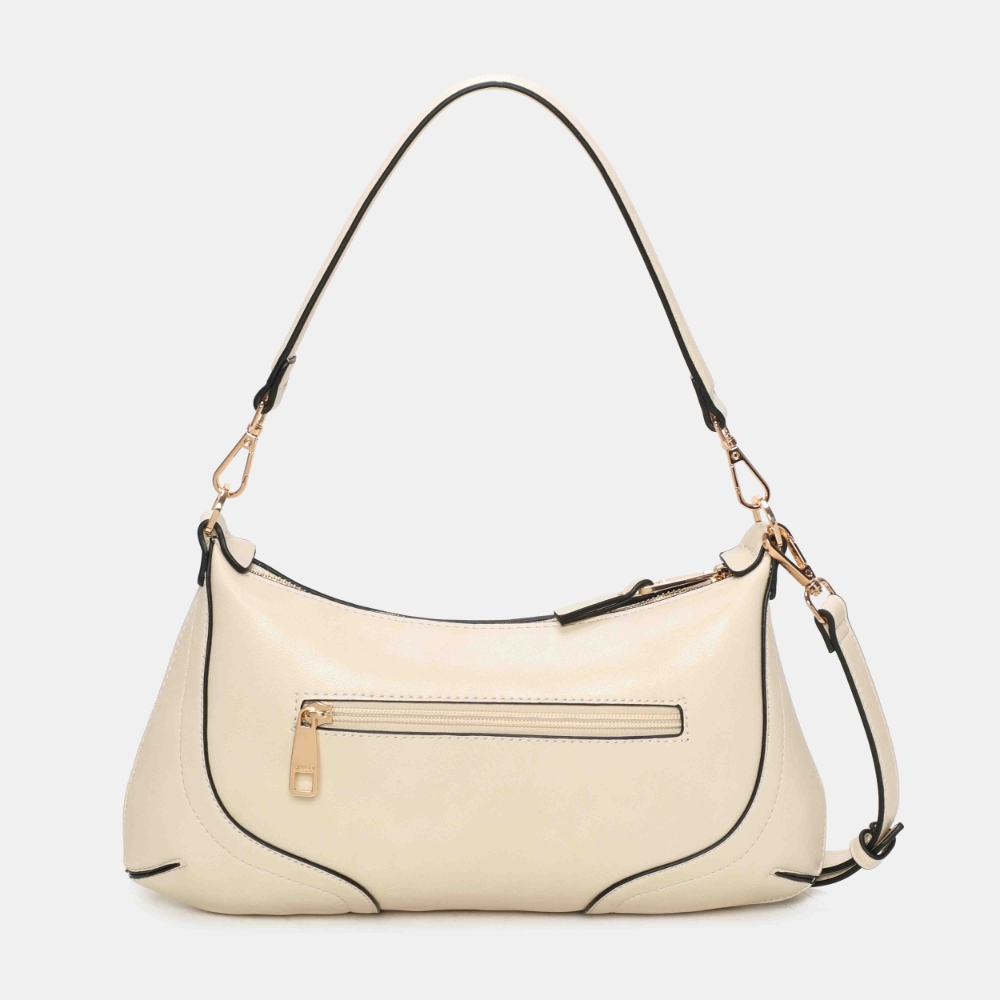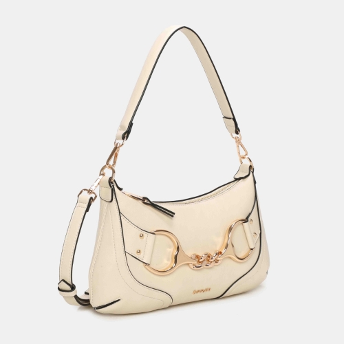 Bolso de hombro pequeño Binnari Lua en color hielo. Confeccionado en material sintético de alta calidad. Formato compacto con asa corta y bandolera. Interior organizado con compartimentos. Detalle metálico decorativo. Medidas: 17 x 33 x 1 cm.