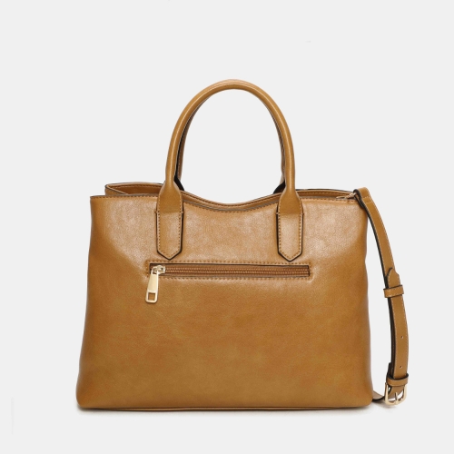 Bolso de mano Binnari Lua en color camel. Fabricado en material sintético resistente. Cierre de clip. Modelo de tamaño medio con asas cortas y bandolera extraíble. Interior organizado con varios compartimentos. Medidas: 25 x 33 x 12 cm.
