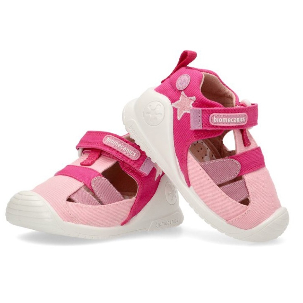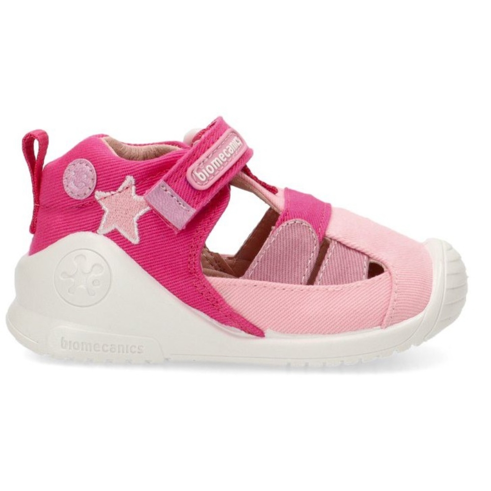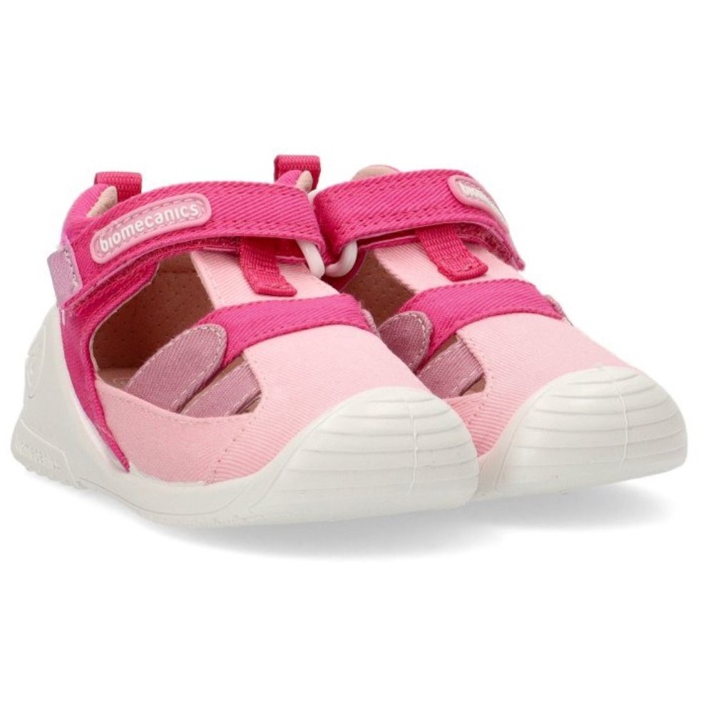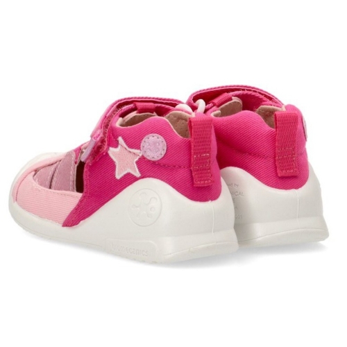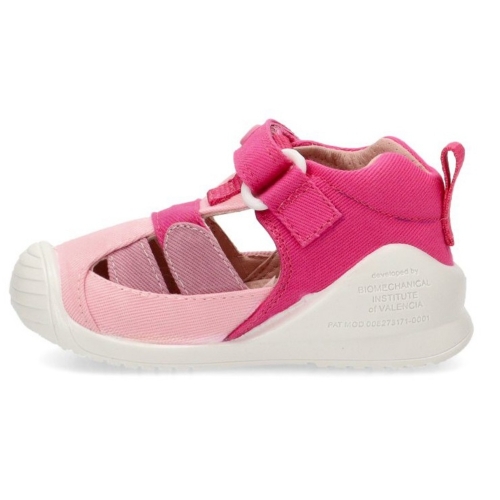 Sandalia respetuosa fabricada en material textil con puntera de goma para niña. Color rosa