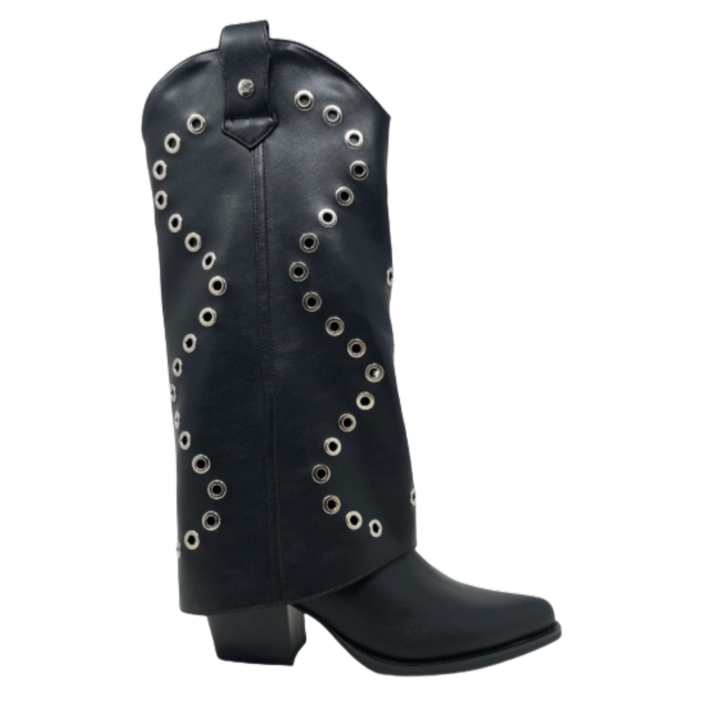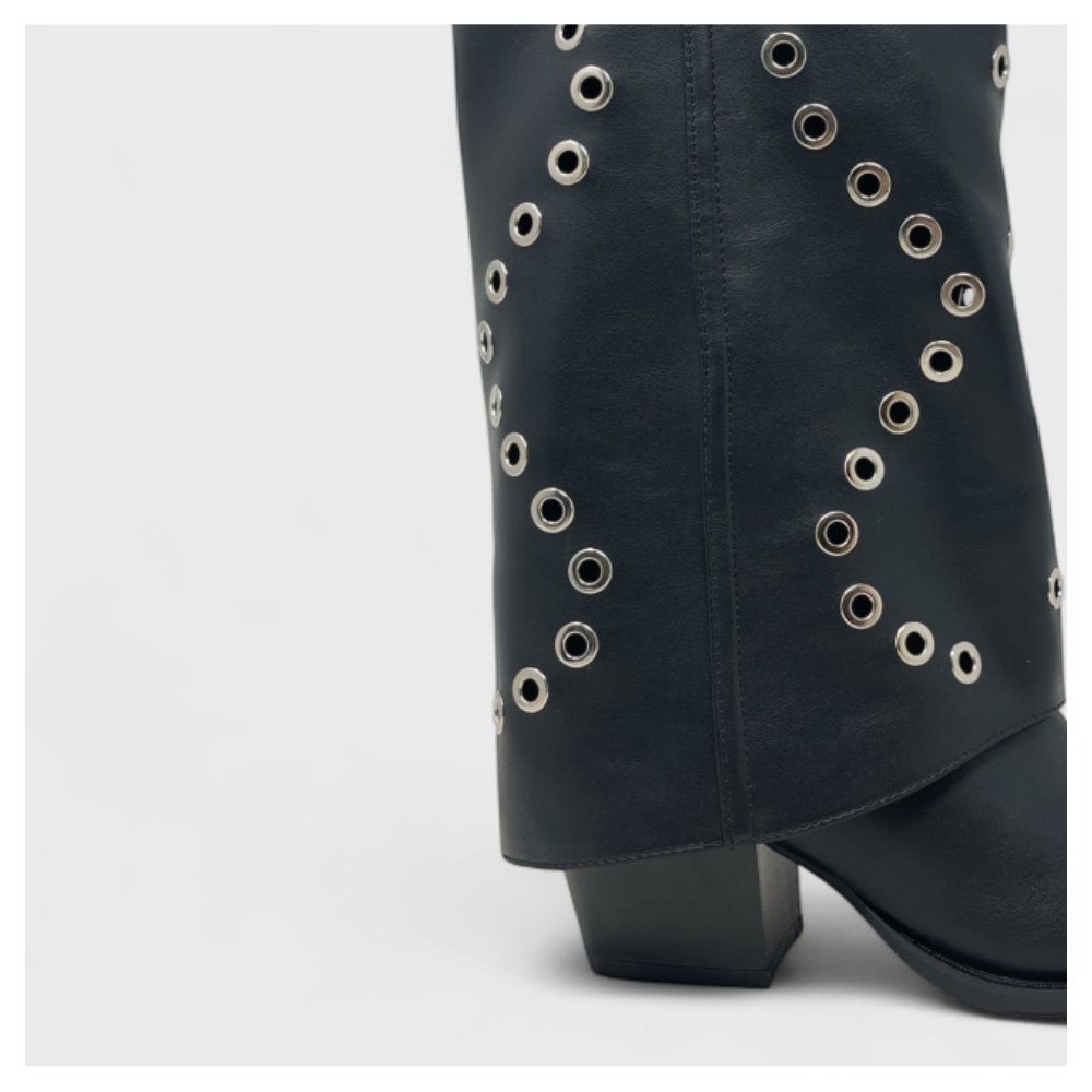Bota solapa con detalles arandelas, facricada en material sintético que imita la piel. Cierre en cremallera lateral en la parte interior. Plantilla en sintético confort. Horma con terminación en punta cuadrada. Tacón con altura de 7cm.