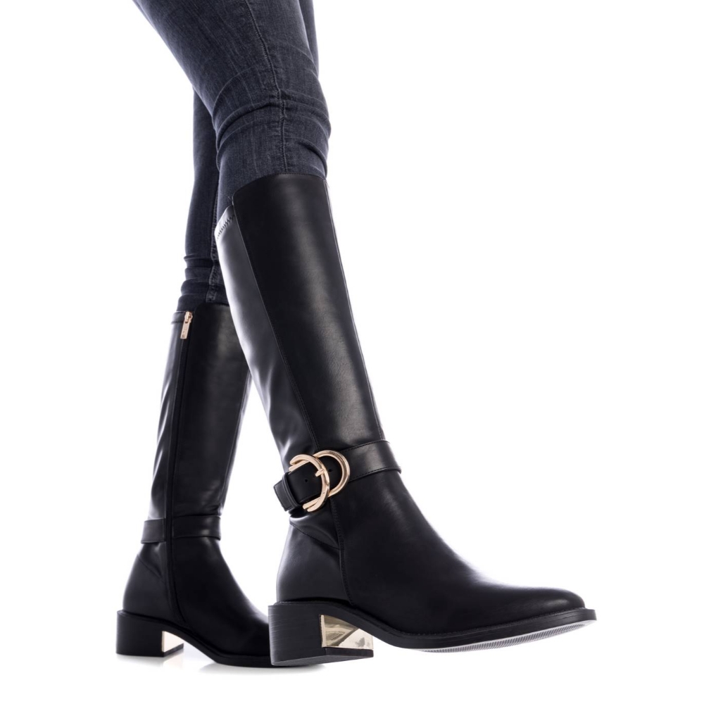 Bota de mujer, de la marca Xti. Fabricado en material que imita la piel. Cierre mediante cremallera lateral. Caña alta proporcionando elegancia. Bota tipo mosquetera con correa decorativa y hebilla metálica. Suela antideslizante. Este modelo ha obtenido el certificado vegano por la organización mundial PETA (Organización de los derechos de los animales).