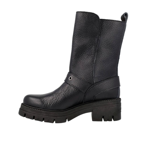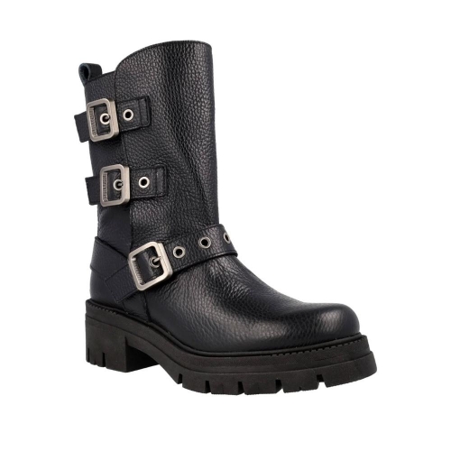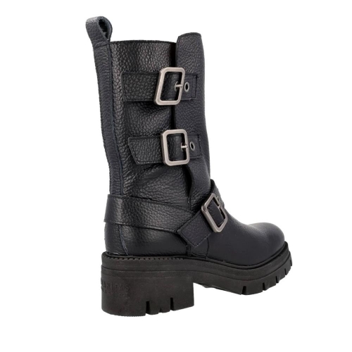 Nuevas biker boots con hebillas estilo motero para mujer, última tendencia en moda. Fabricadas en piel de primera calidad con 3 hebillas metálicas en el lateral, forro en microfibra y suela de goma estilo track con 5cm de altura. Este calzado incorpora la tecnología TRIFLOW que amortigua cada paso aportando flexibilidad y confort en la pisada, gracias a su triple almohadillado. Combina fácilmente esta bota de caña media con tus look de invierno. Diseño y fabricación española.