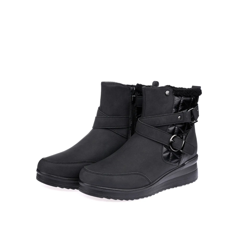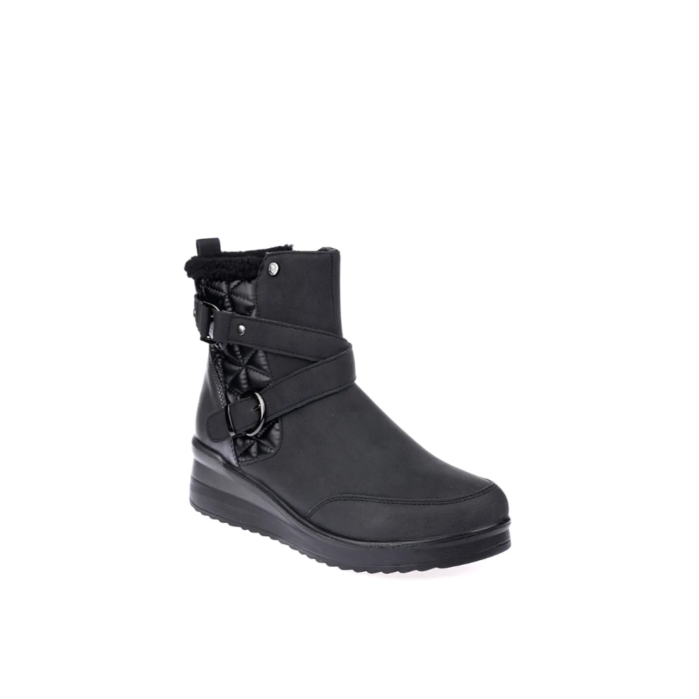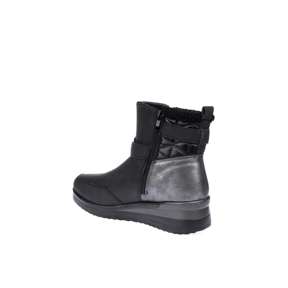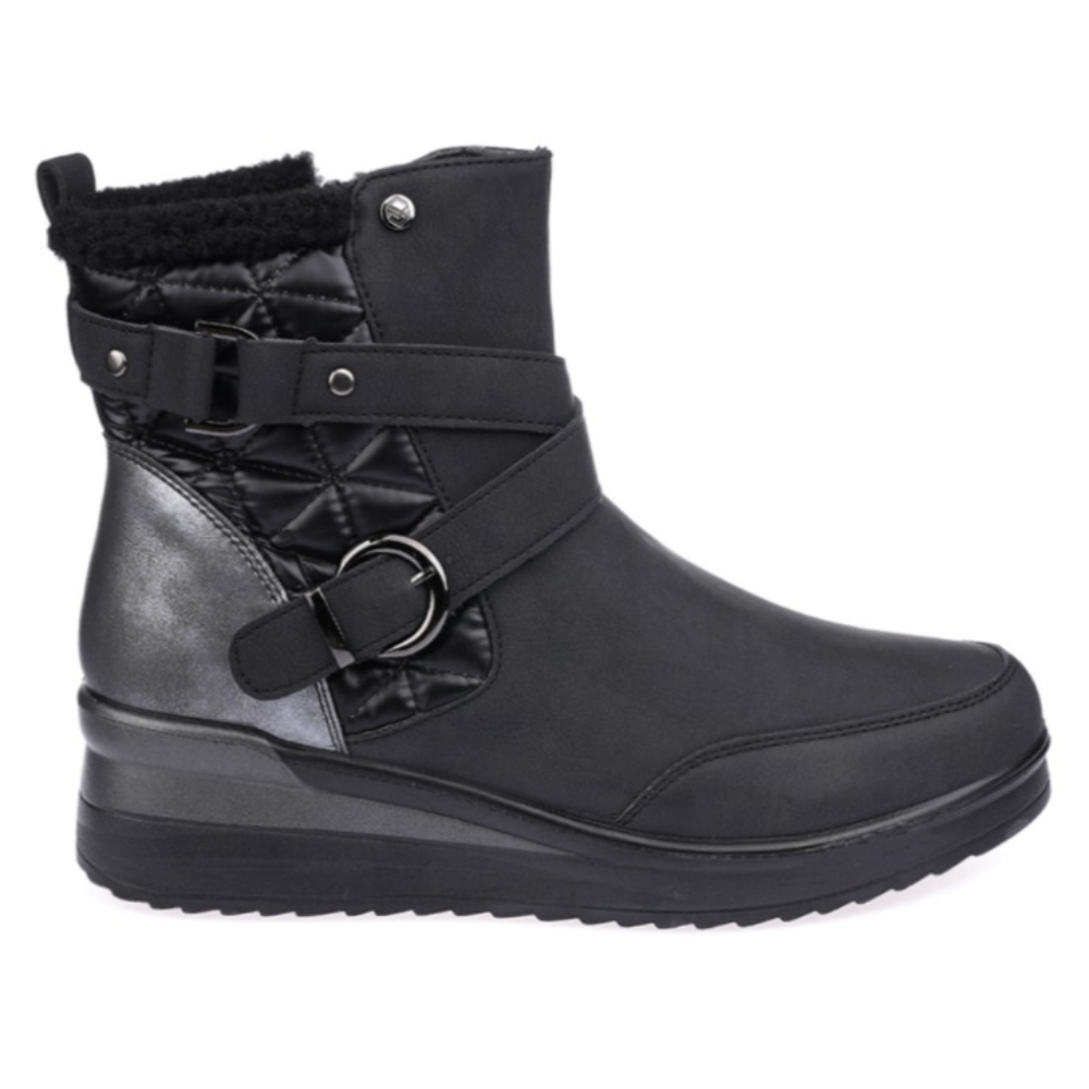 Botin con para mujer de la marca Mysoft, modelo 24m575. Fabricado en material que imita la piel en diferentes texturas. Cierre mediante cremallera lateral. Tirador trasero para facilitar la puesta. Correa con hebillas metalizadas decorativas. Cómoda cuña de 5 cm con suela antideslizante.