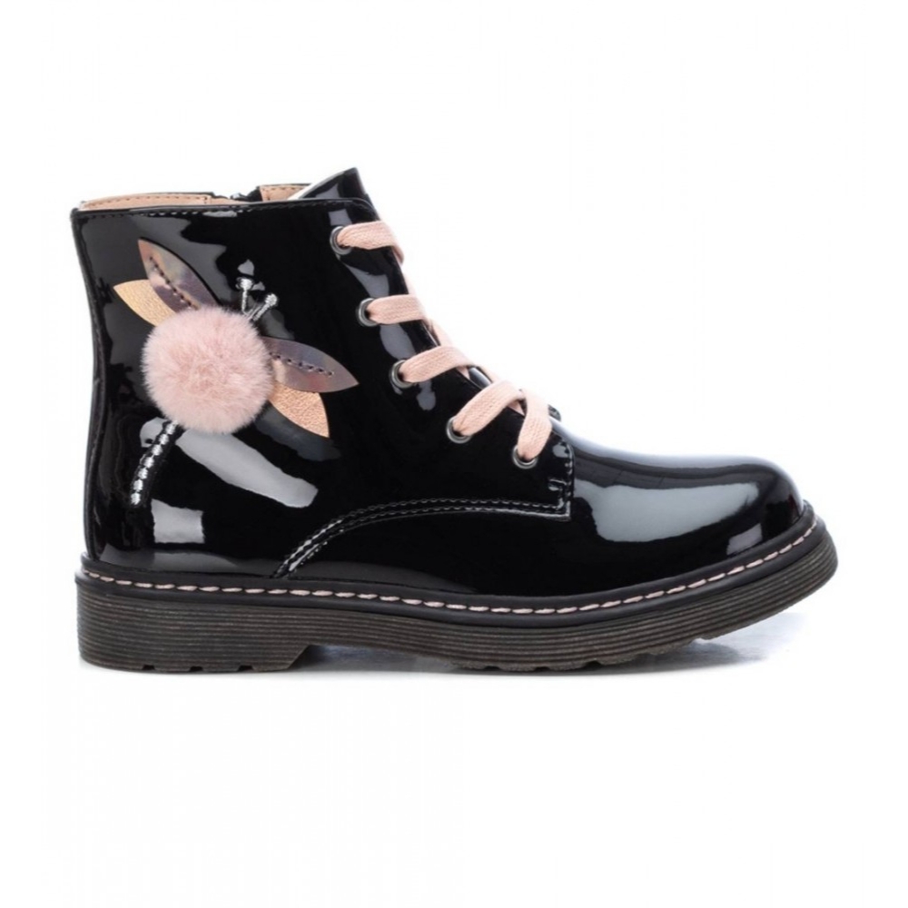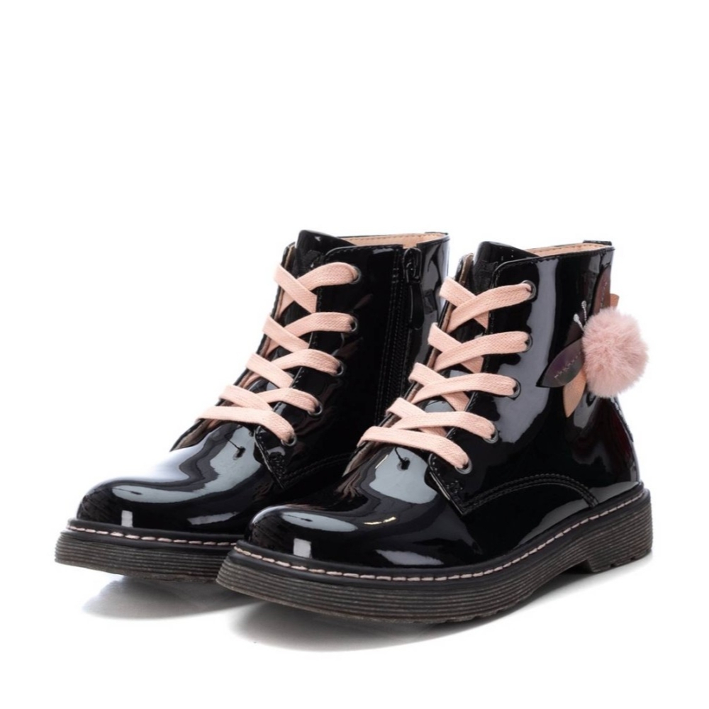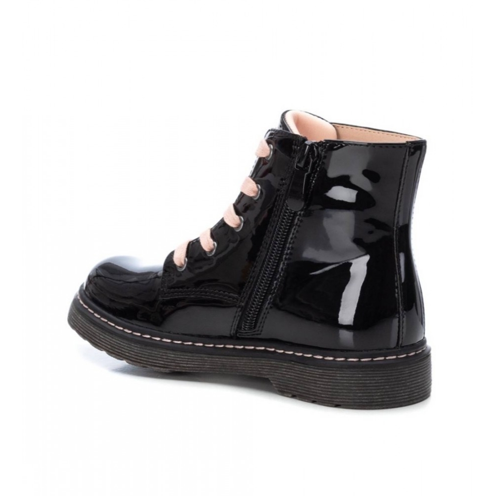 Botin estilo militar con cordón de la marca Xti para niña. Fabricado en material sintético estilo brillo con detalle en el lateral y cremallera. Color negro