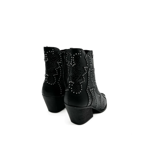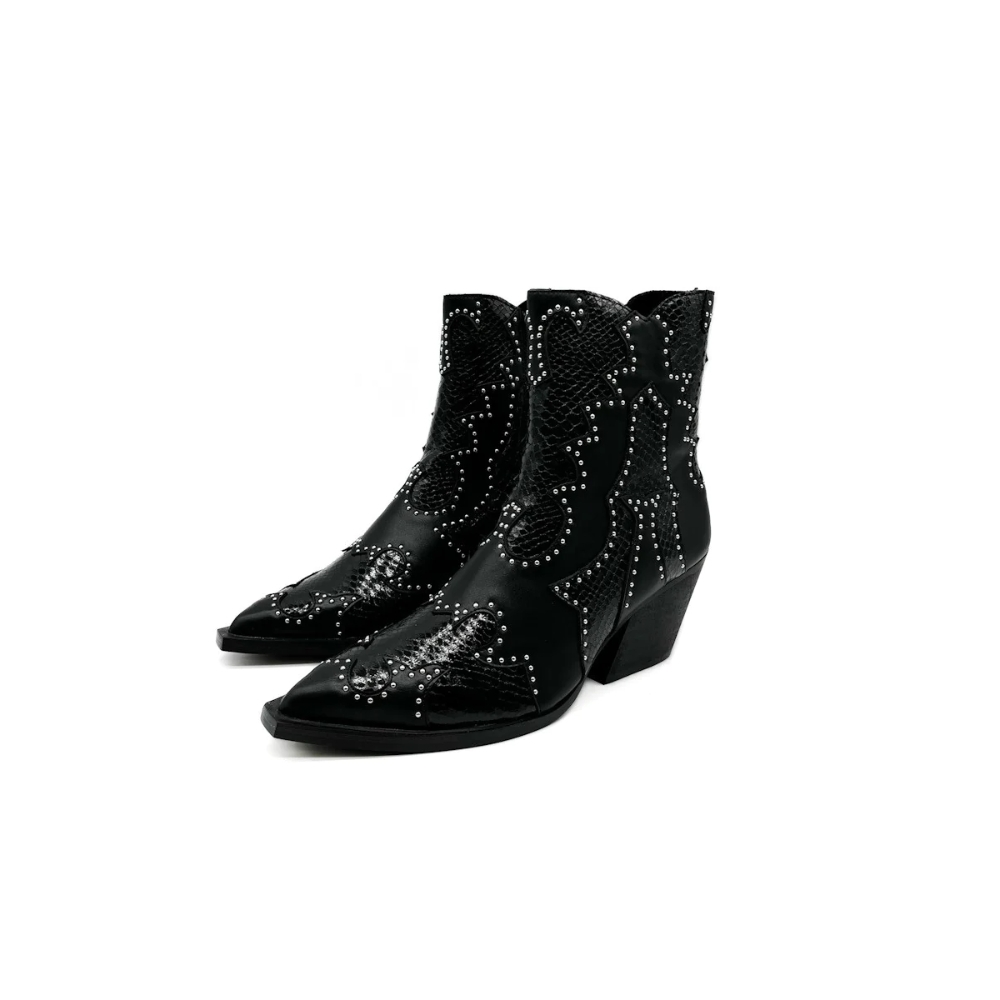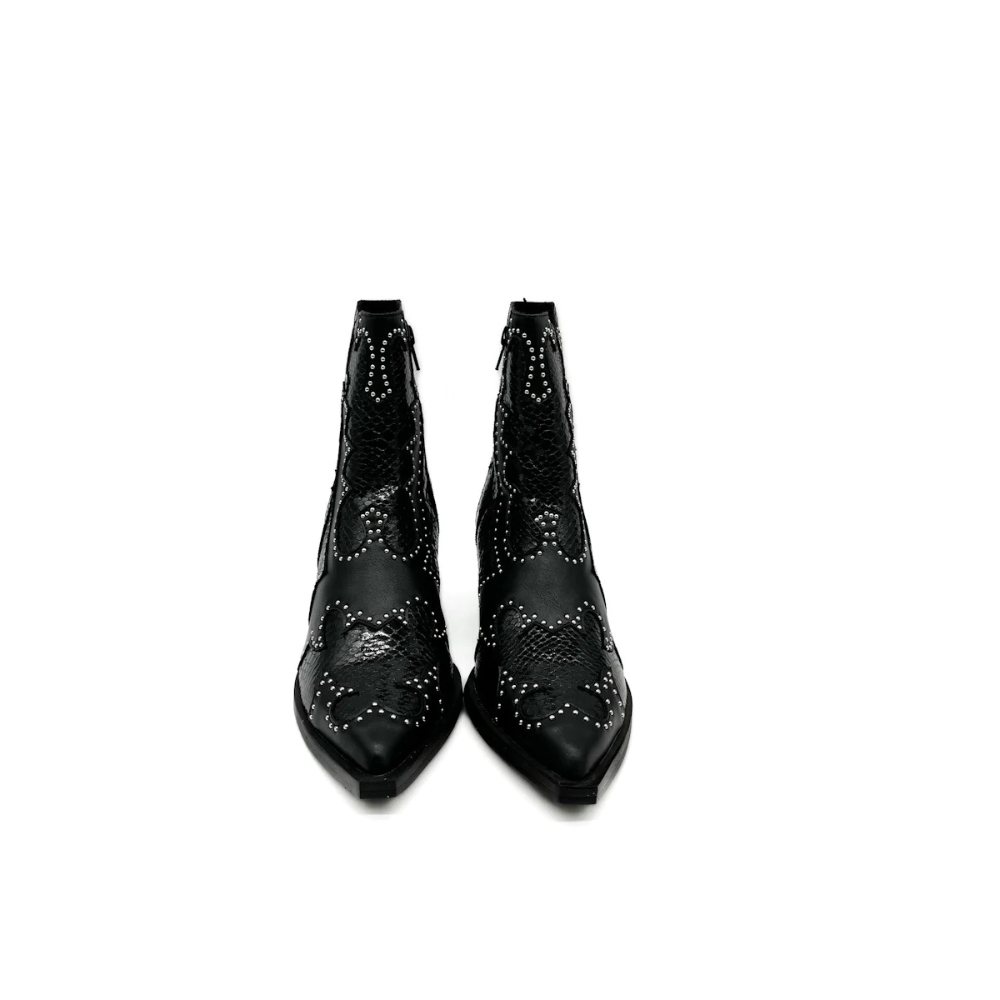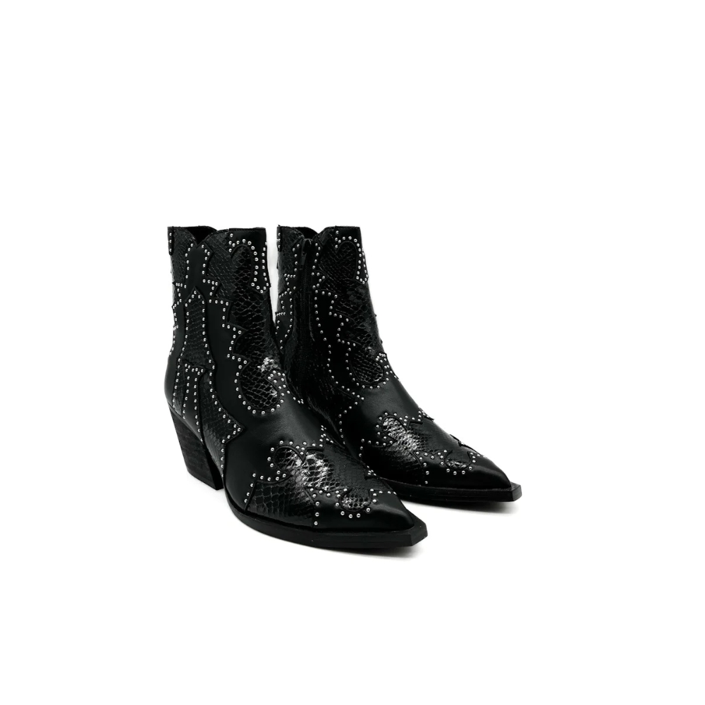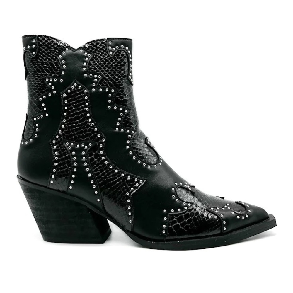 Botín estilo cowboy. Corte con mezcla de materiales y colores en contraste y detalle de tachas. Cremallera en el lateral interior. Altura del tacn 6.6 cm, Altura de la caa 15 cm