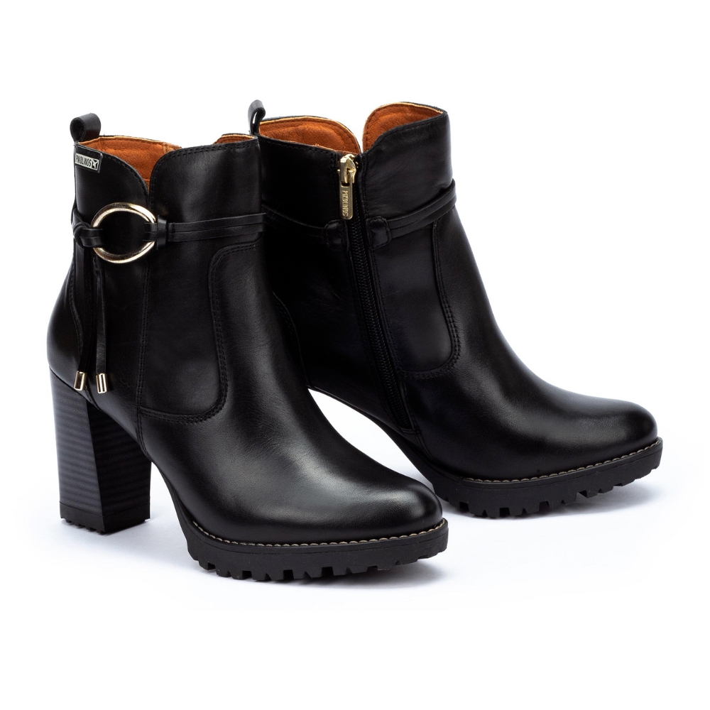 Botin con tacón alto de la marca Pikolinos para mujer. Fabricado en piel de gran calidad y cremallera lateral. Color negro