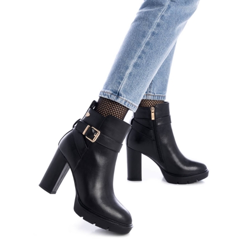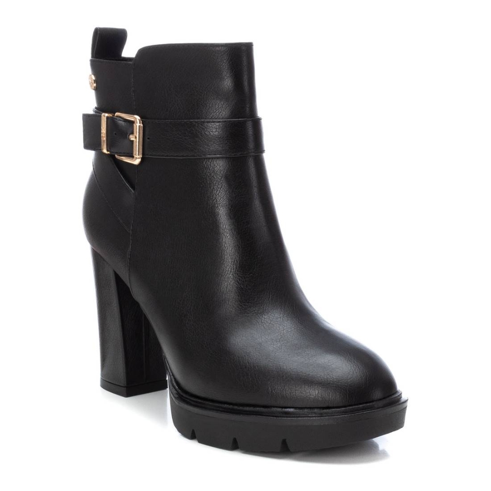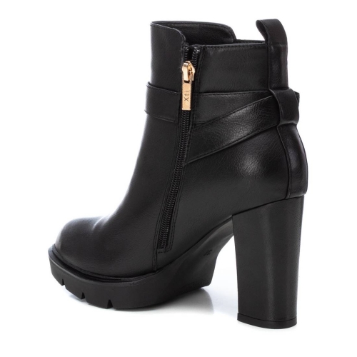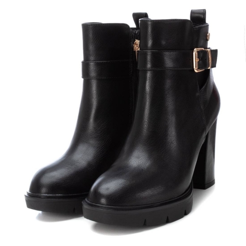 Botín de mujer, de la marca Xti. Fabricado en un material que imita la piel. Cierre mediante cremallera lateral. Suela gruesa y antideslizante, tacón de 9 cm. Con hebilla metalizada decorativa. Este modelo ha obtenido el certificado vegano por la organización mundial PETA (Organización de los derechos de los animales).