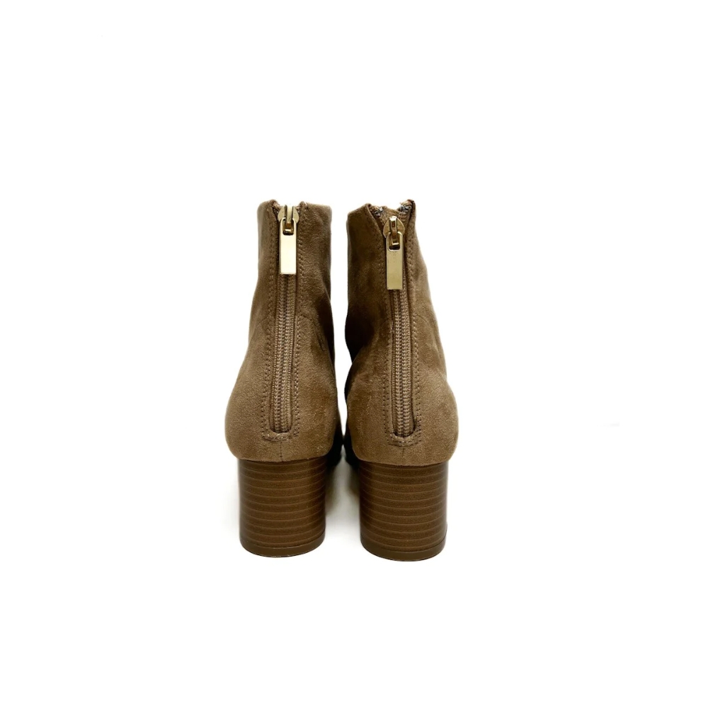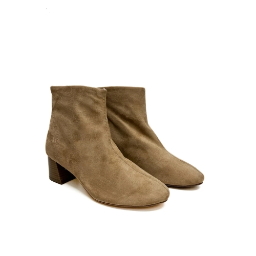 Botines en material efecto ante. Tacón medio ancho. Acabado en punta redondeada. Cierre mediante cremallera en la parte trasera.