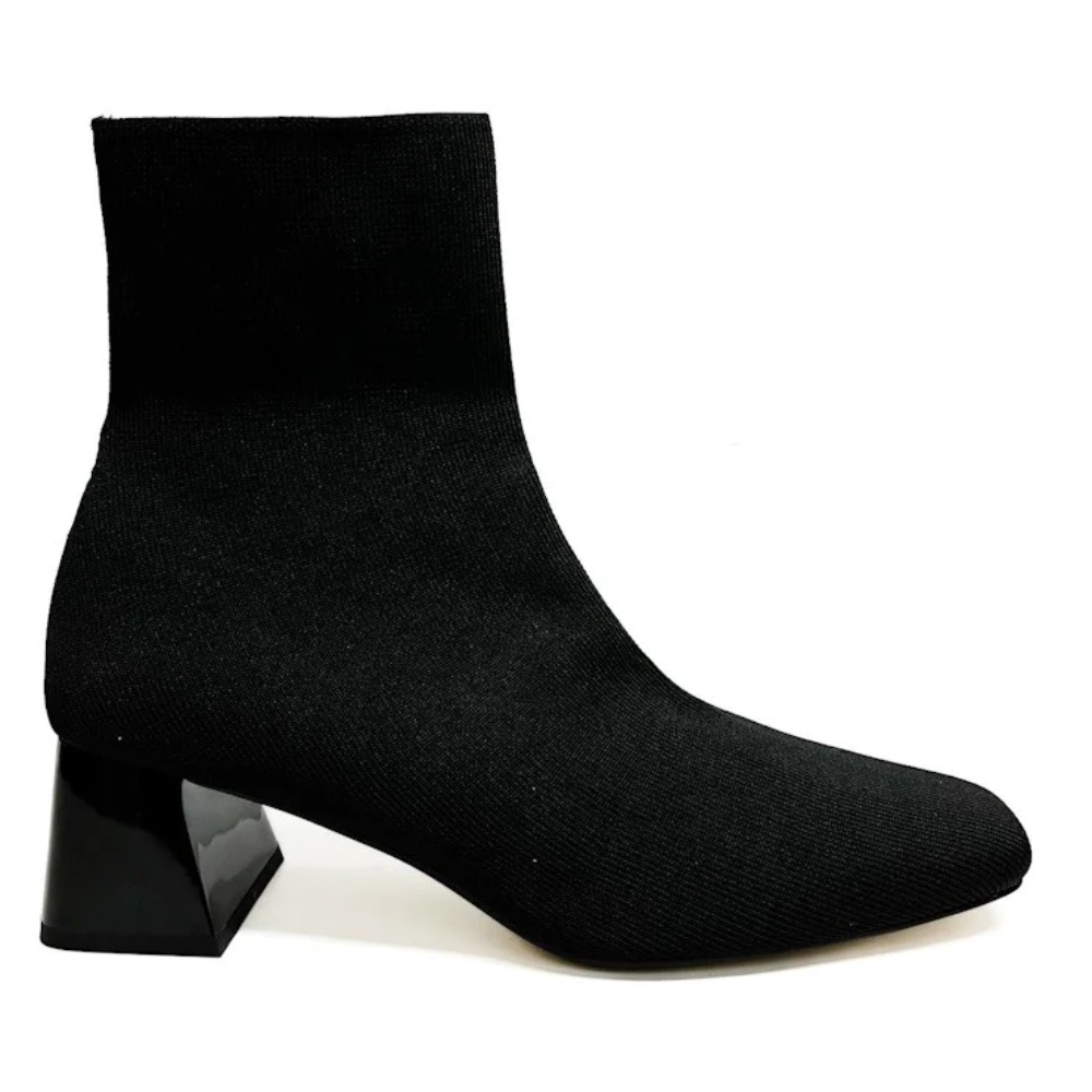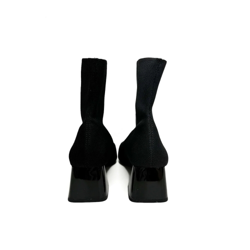 Botines de tacón ancho, tipo calcetín. Caña ceñida y corte en tejido elástico. Acabado en punta cuadrada.