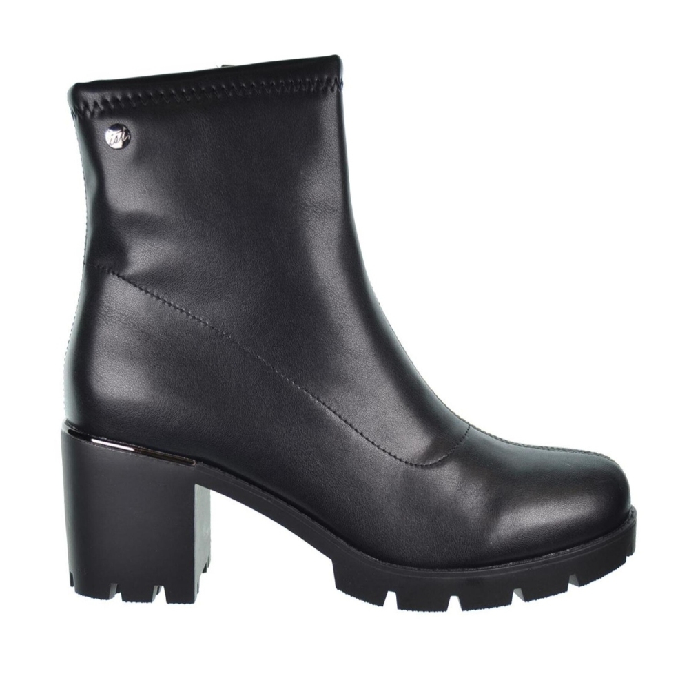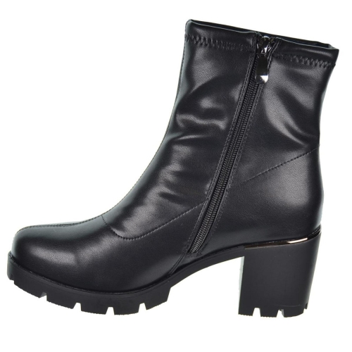 Botin con tacón y pequeña plataforma de la marca Isteria para mujer. Fabricado en material sintético con cremallera interior. Suela de caucho antideslizante con tacón de 6,5 cm de altura. Color negro