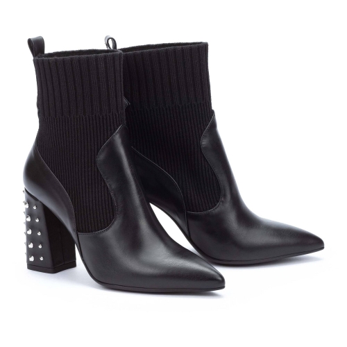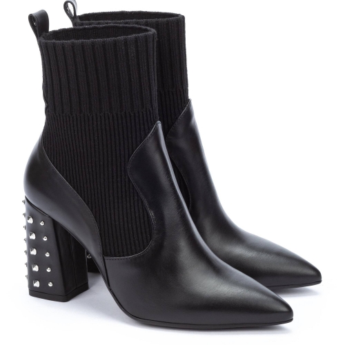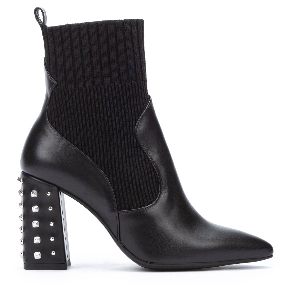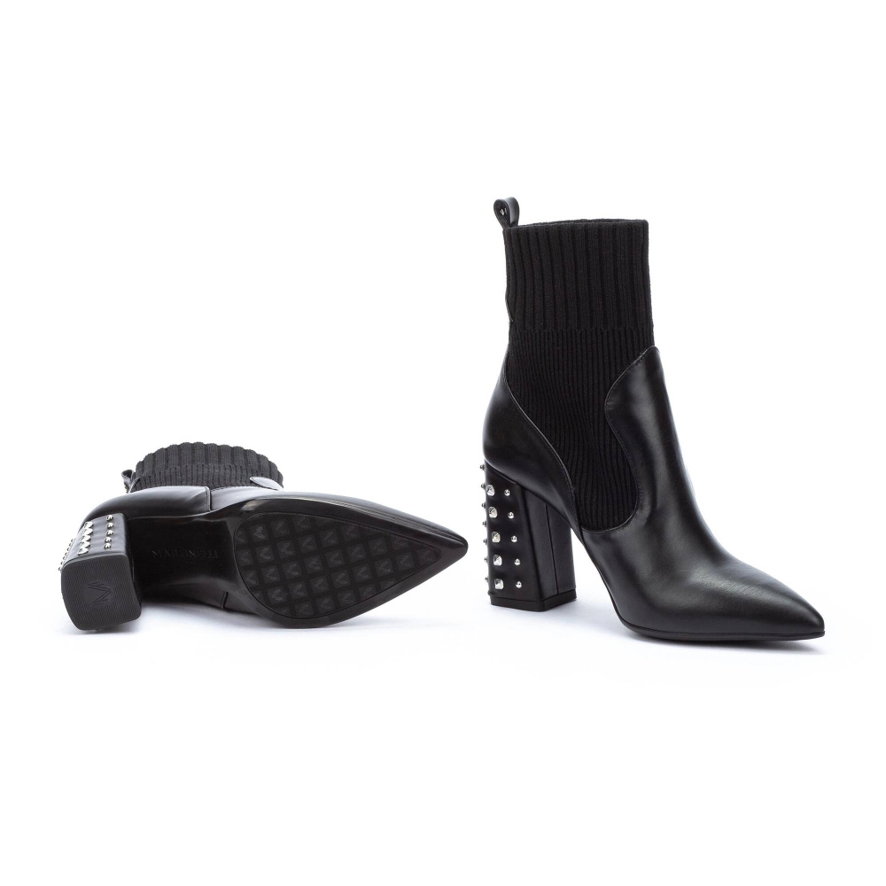 Botín con tacón alto de vestir de la marca Martinelli para mujer. Fabricado en España con piel de gran calidad y tachuelas en el tacón. Color negro