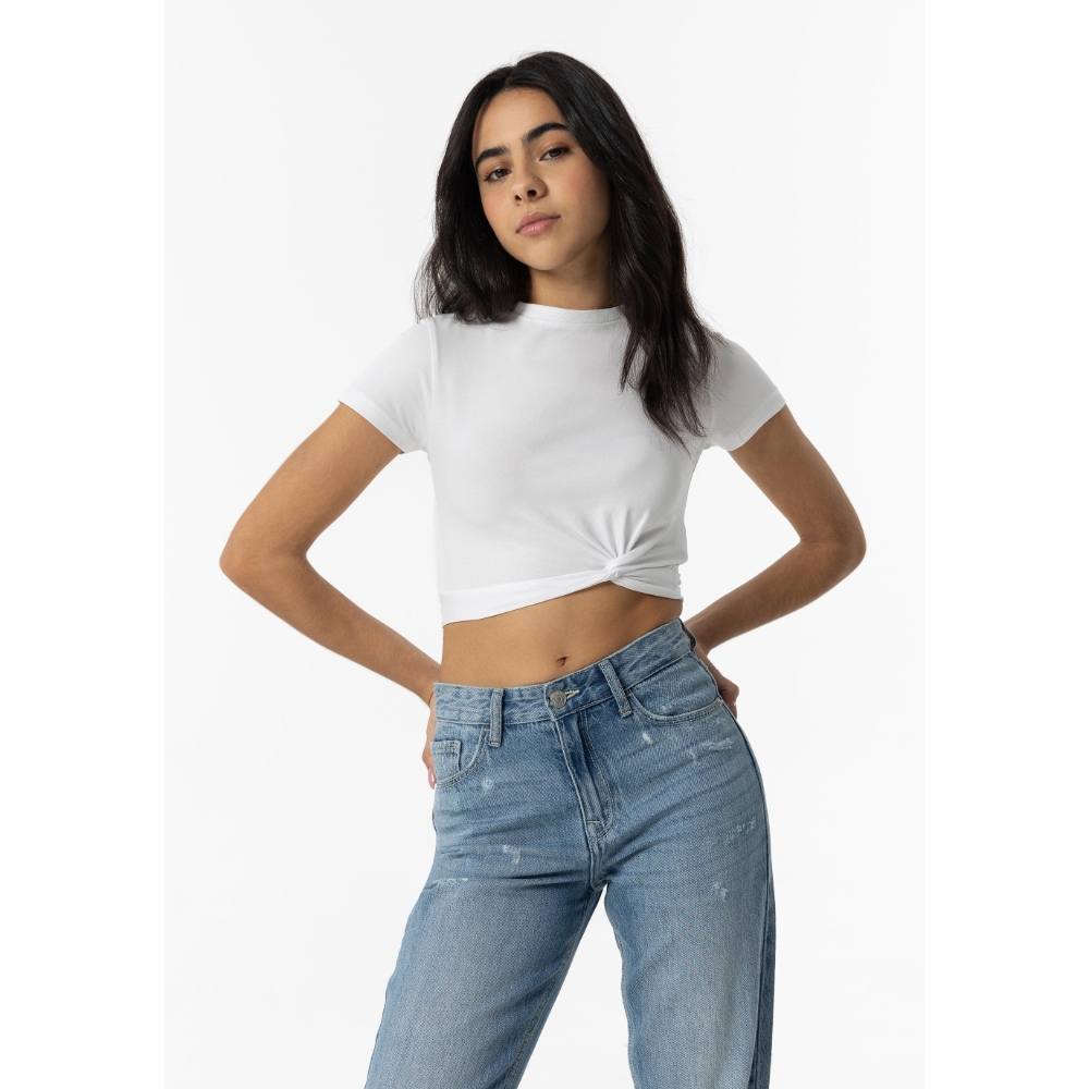 Camiseta con cuello redondo y manga corta. Detalle nudo delantero.