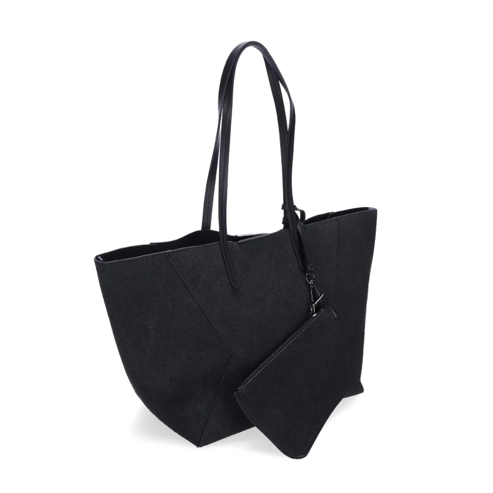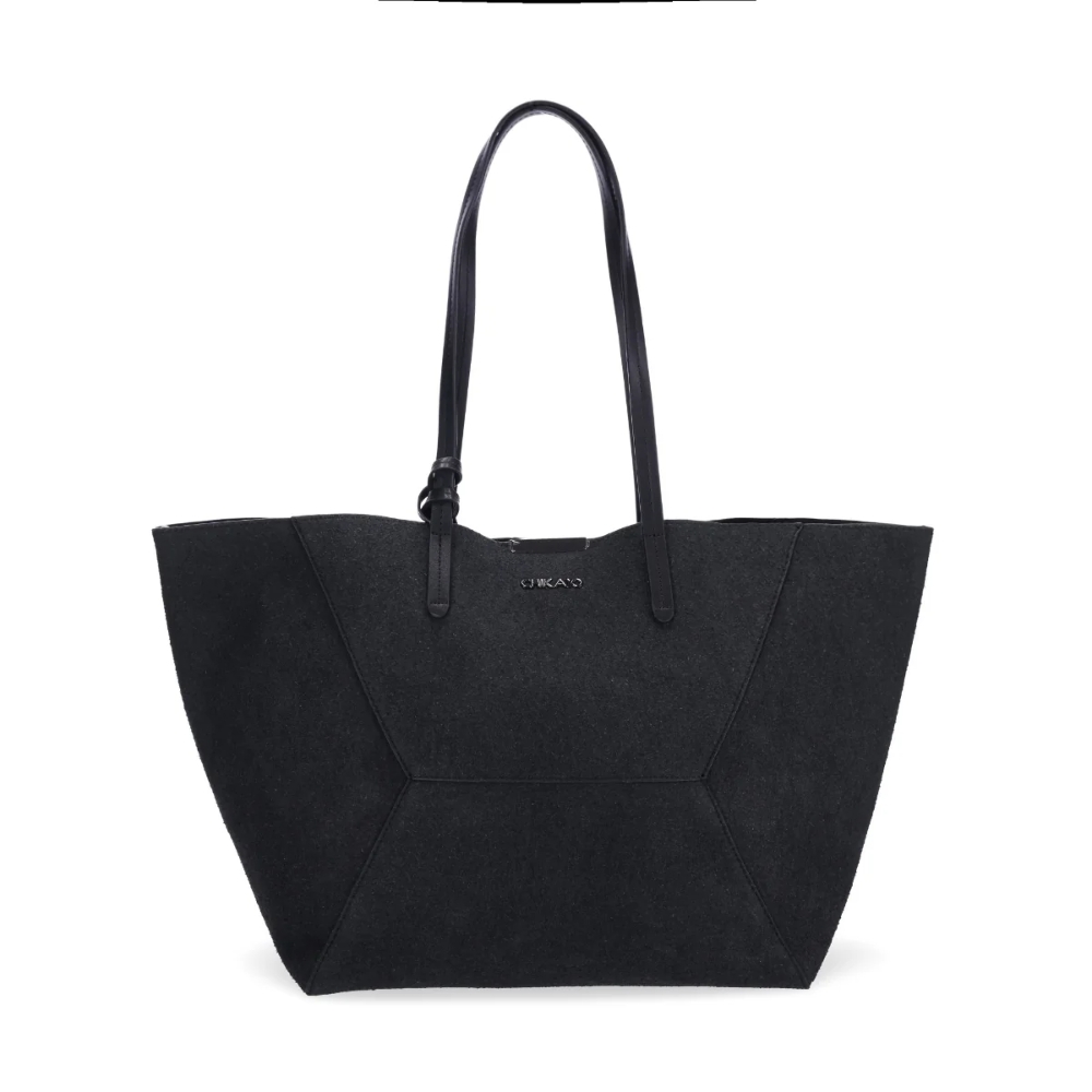 Bolso Tote con Estilo Geométrico: Este bolso presenta un diseño elegante y funcional con un patrón geométrico cosido en el frente. Incluye dos asas largas y un detalle metálico decorativo cerca de la parte superior. Ideal para quienes buscan un accesorio versátil y con estilo.