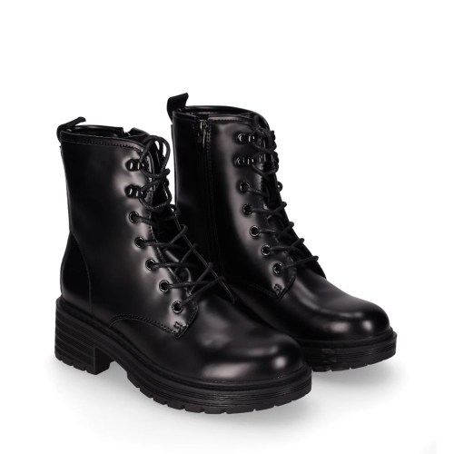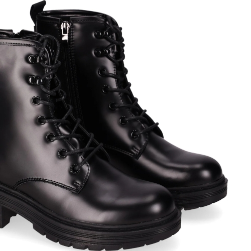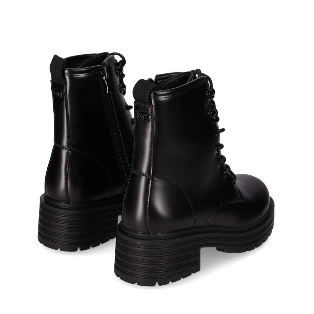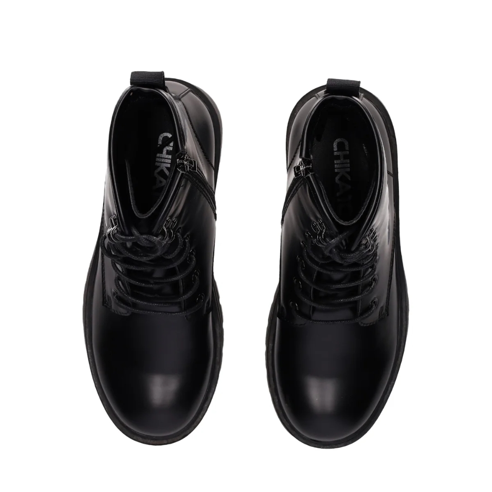 Botines estilo chunky con cierre acordonado. Con estilo militar, cuenta con un acabado pulido y cordones que pasan por ojales metálicos. La suela gruesa y rugosa proporciona un mayor agarre, mientras que la lengüeta trasera facilita su uso. ¡Rompe tu estilo pisando fuerte!