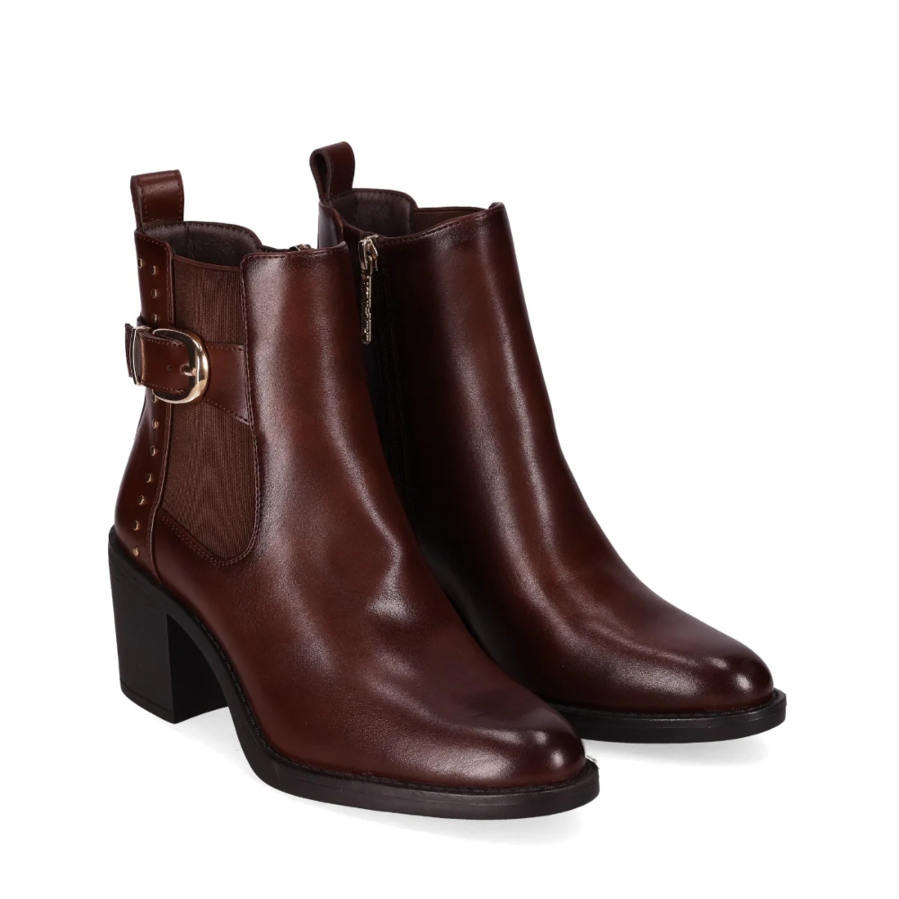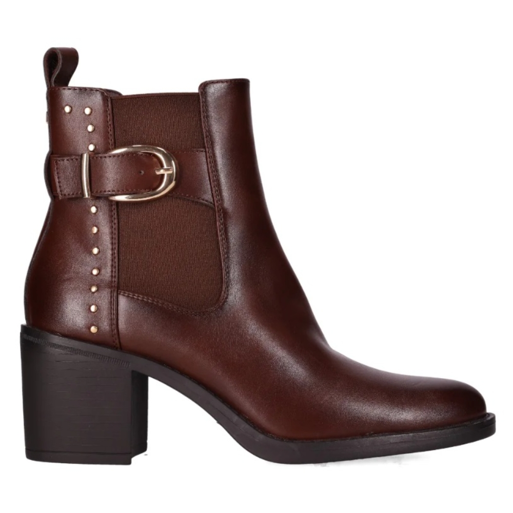 Botín con tacón chunky y hebilla lateral. Este botín presenta un diseño elegante y moderno, con un tacón chunky y una hebilla lateral decorativa con estoperoles metálicos. El panel elástico lateral facilita su uso y proporciona comodidad. Conviértelo en un básico en tu día a día.