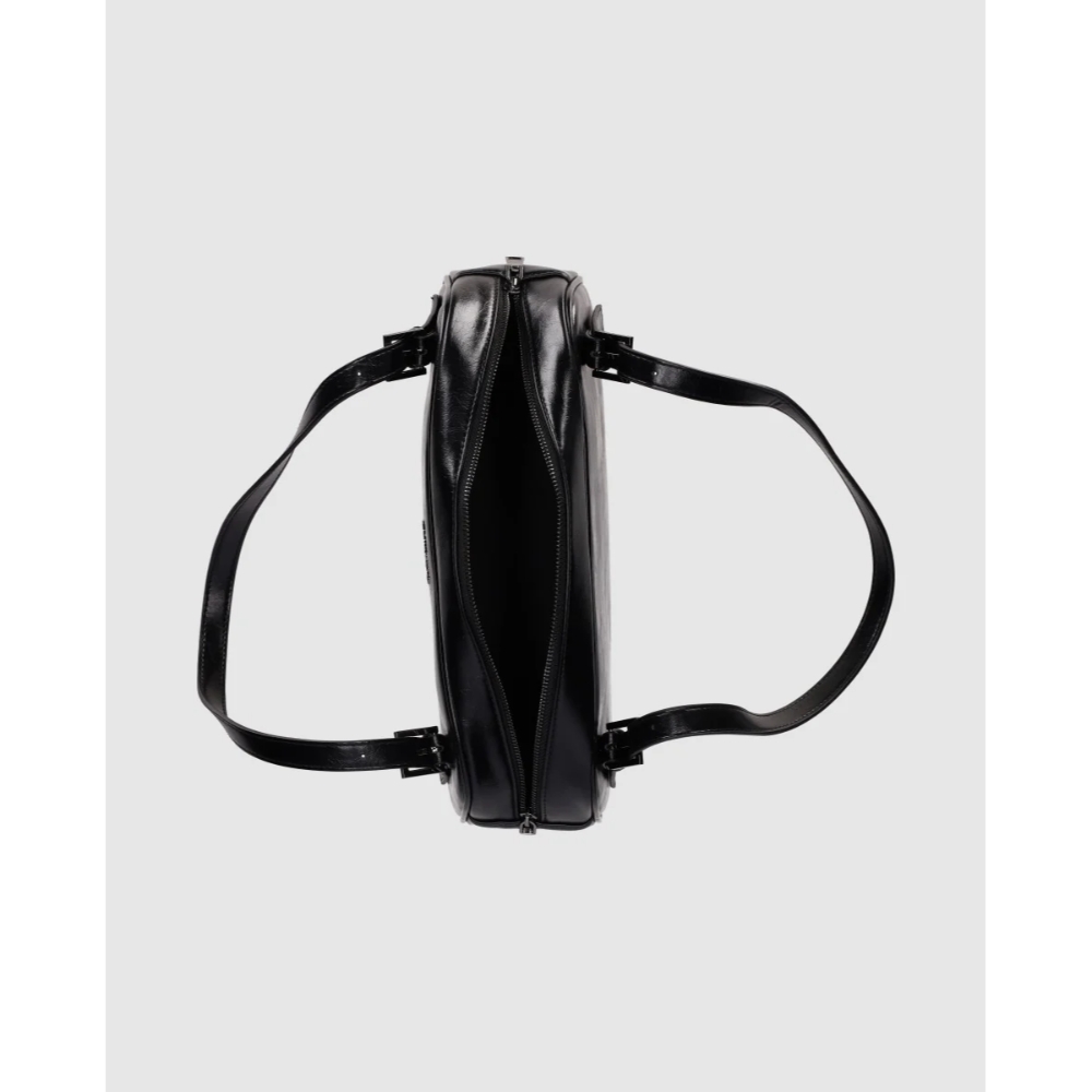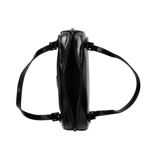 Bolso de Cuero con Diseño Ajustable: Este bolso presenta una forma rectangular con bordes redondeados y dos correas ajustables mediante hebillas decorativas. Su diseño elegante y funcional incluye el nombre de la marca en el frente, ideal para complementar un estilo moderno y práctico.