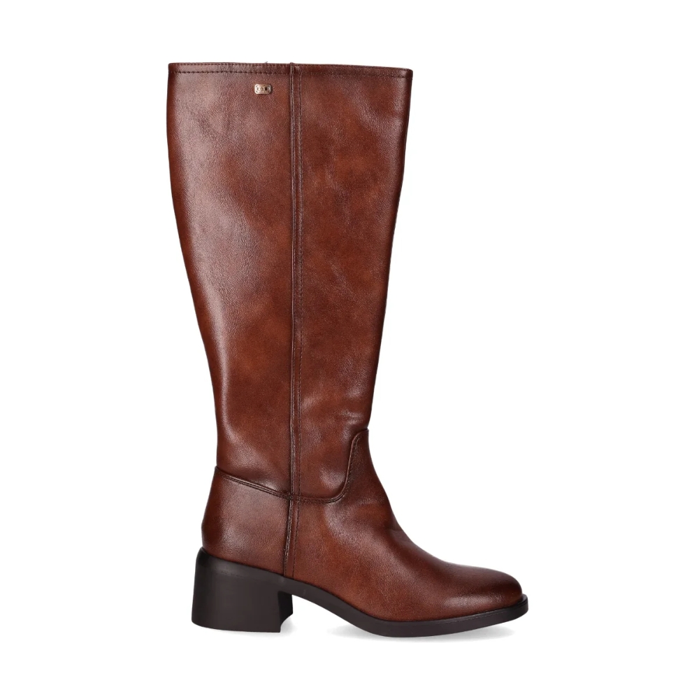 Botas altas diseñadas en piel vegana. Elegante diseño de caña alta con un acabado desgastado y un ligero brillo. La puntera redondeada, un tacón bajo de bloque, la costura vertical y su cierre con cremallera en el lateral añaden un detalle sutil y estilo moderno. ¡Combina estilo y confort en cada paso!