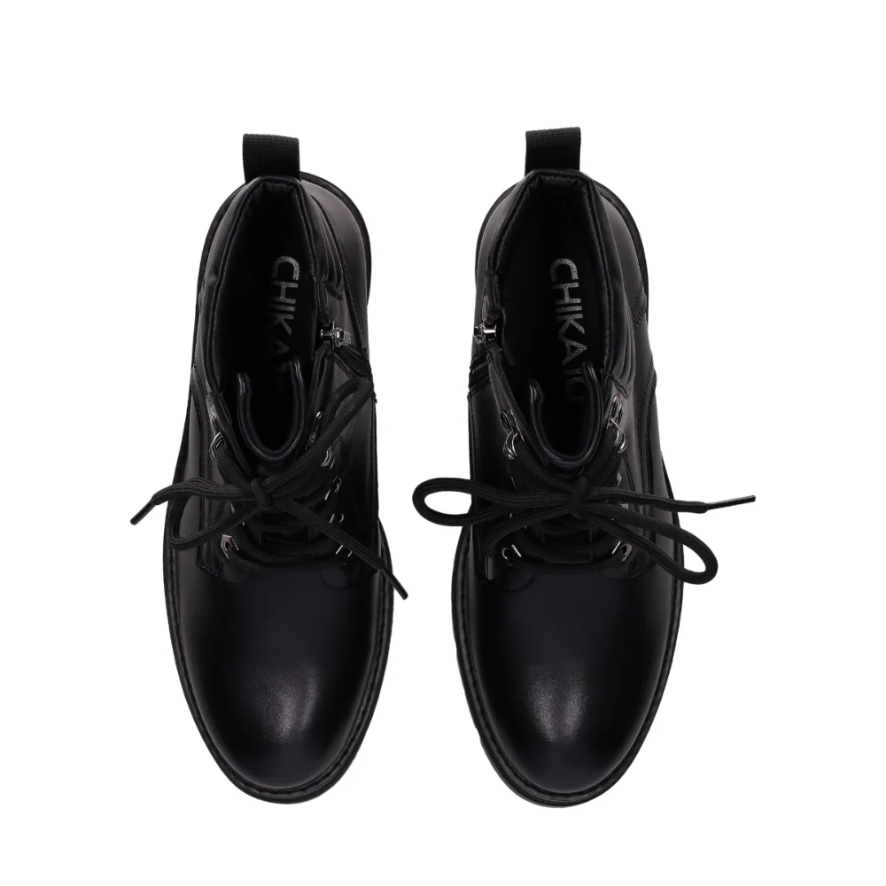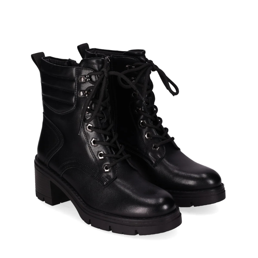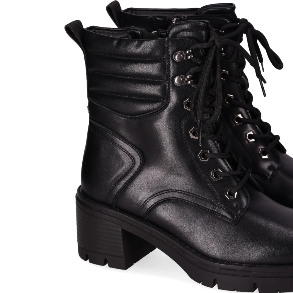 Botín de piel vegana con tacón chunky: Este botín cuenta con un tacón chunky, cordones con ojales dorados, collarín acolchado, y lengüeta trasera para mayor comodidad. La suela gruesa y con dibujo profundo ofrece excelente tracción. Perfecto para caminar por el lado elegante de la vida.
