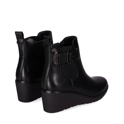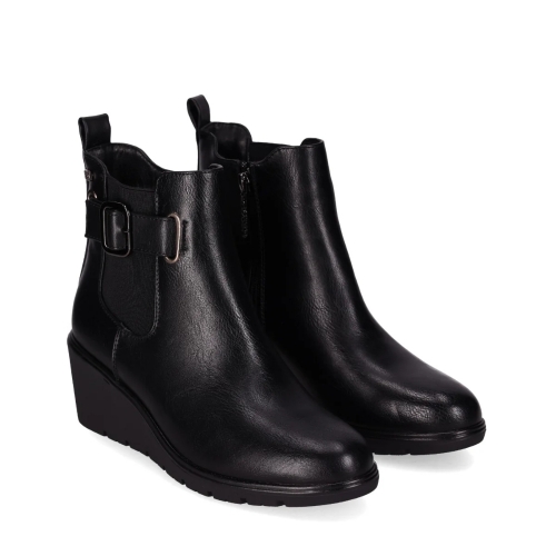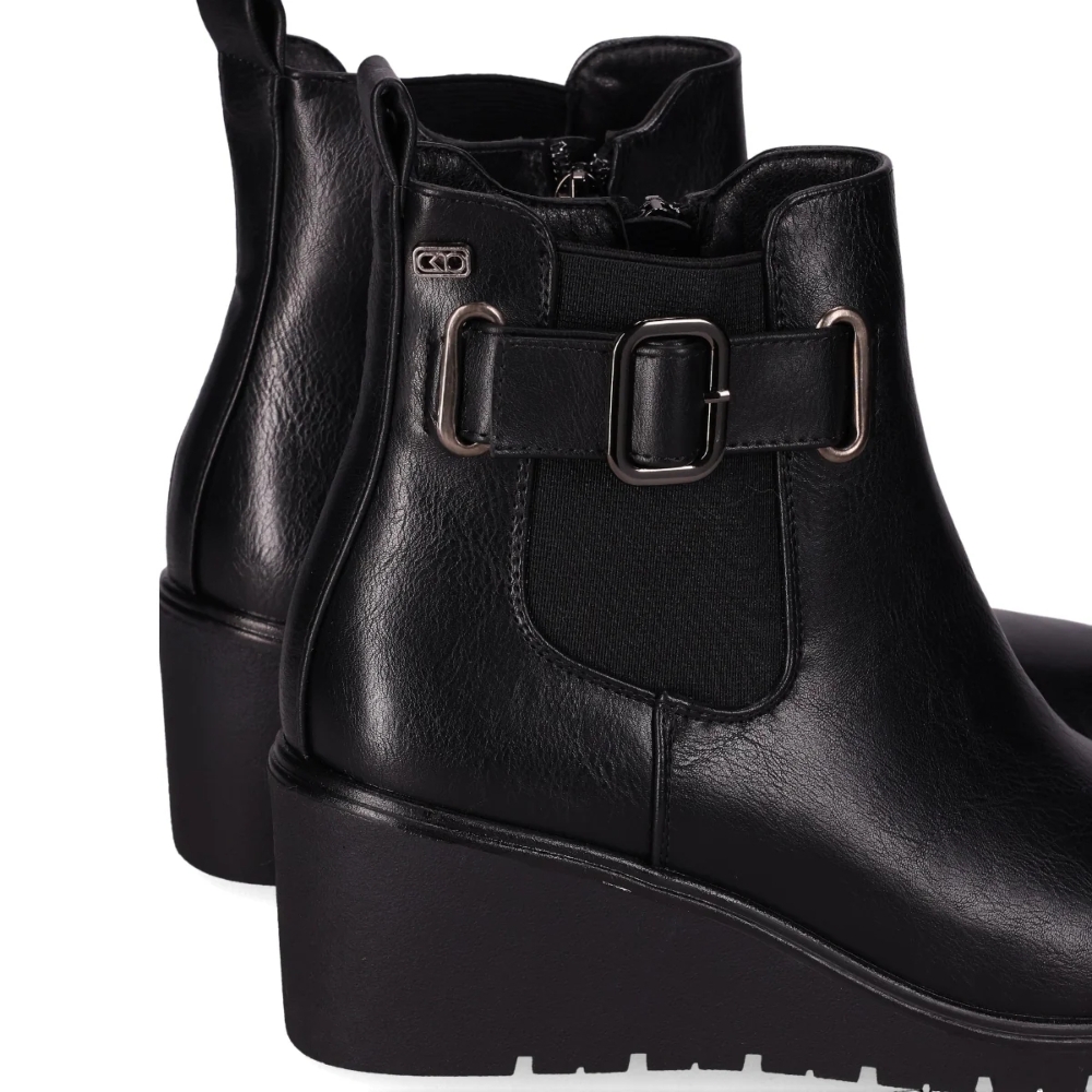 Botines de cuña baja en piel vegana. Diseñados con caña baja, cuentan con un tacón de cuña y una correa con hebilla decorativa en el lateral. El panel elástico garantiza un ajuste cómodo y práctico, además de su cremallera lateral para mayor adaptación. ¡Combina estilo moderno y funcionalidad en un solo paso!