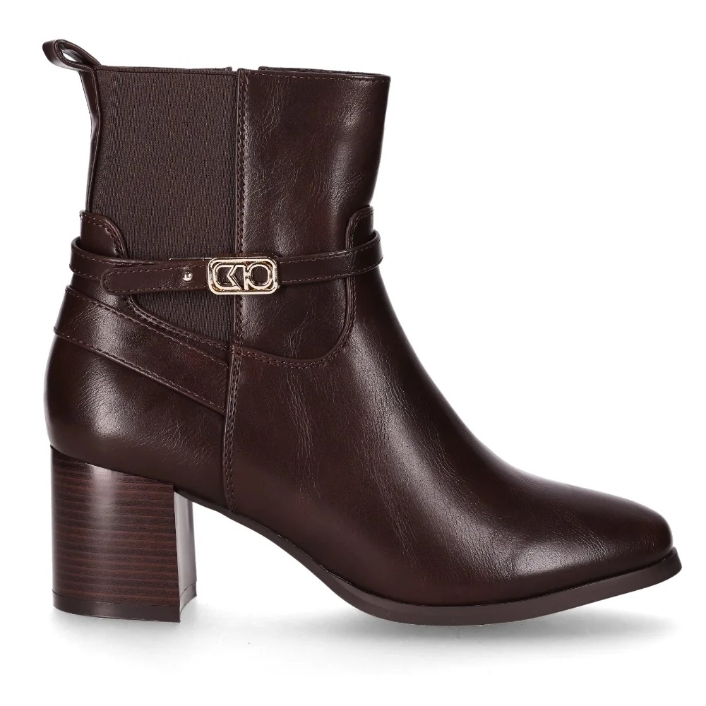 Botin de tacón con panel elástico. Este diseño de tacón ancho, cuentan con un acabado elegante en cuero pulido al frente y un panel elástico en la parte posterior para un ajuste perfecto. La correa decorativa con hebilla alrededor del tobillo añade un toque moderno. ¡Ideal para combinar estilo y funcionalidad en tus outfits!