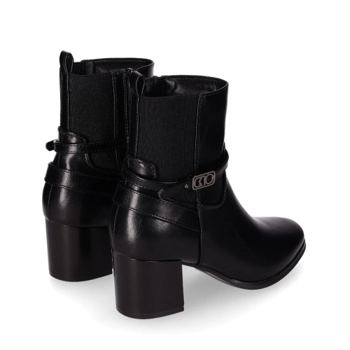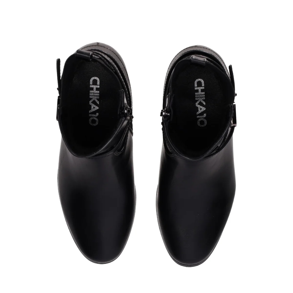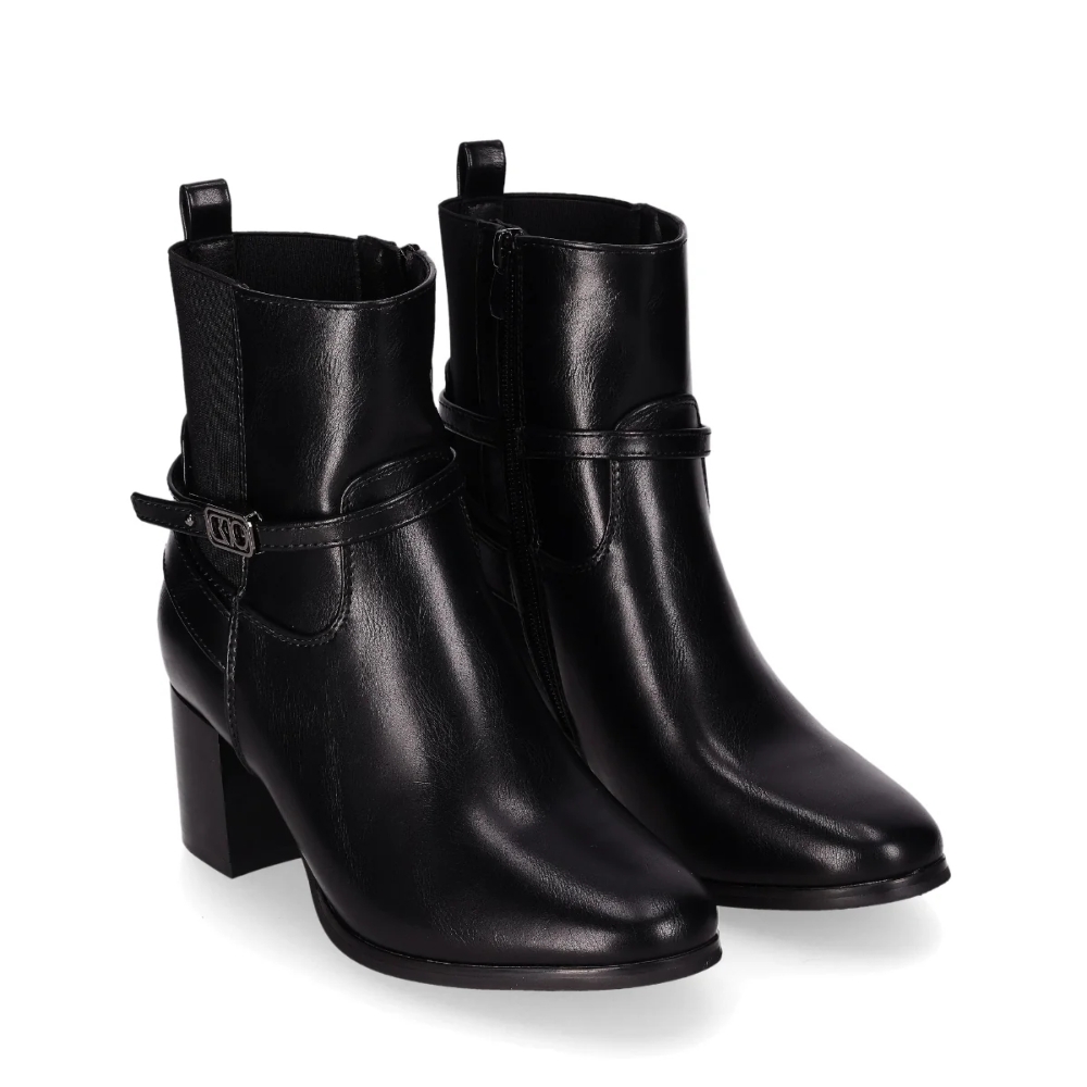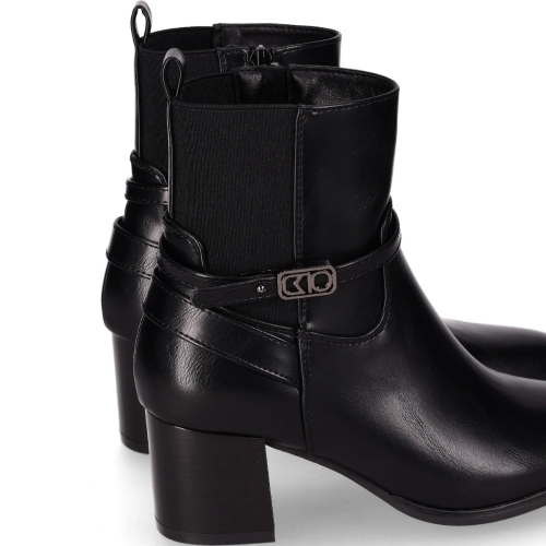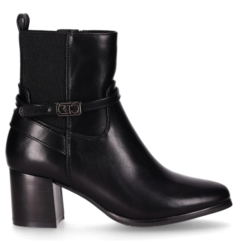 Botin de tacón con panel elástico. Este diseño de tacón ancho, cuentan con un acabado elegante en cuero pulido al frente y un panel elástico en la parte posterior para un ajuste perfecto. La correa decorativa con hebilla alrededor del tobillo añade un toque moderno. ¡Ideal para combinar estilo y funcionalidad en tus outfits!