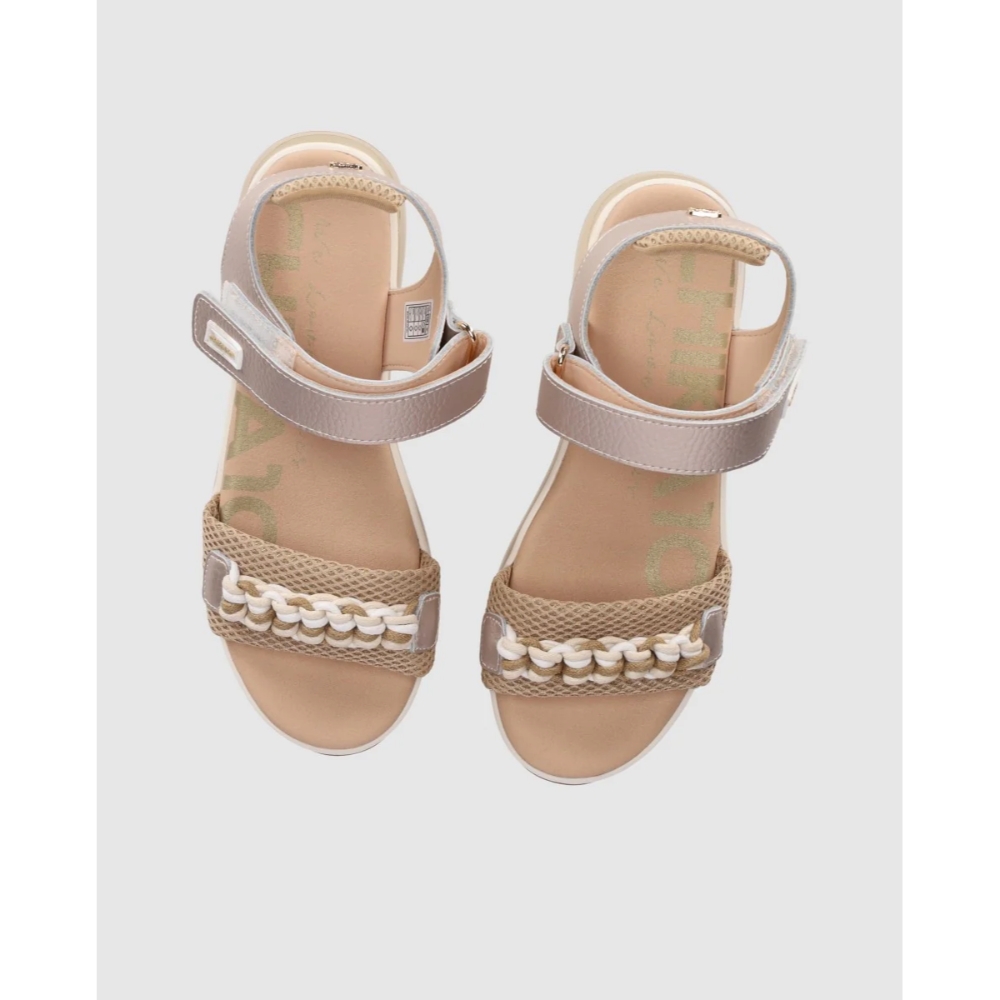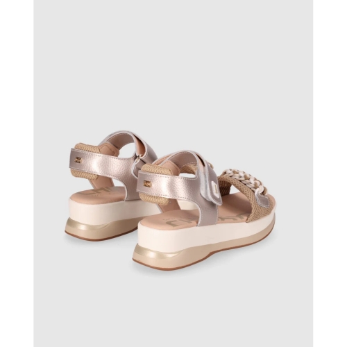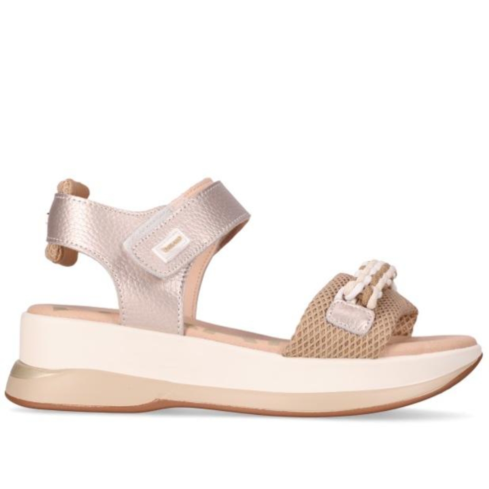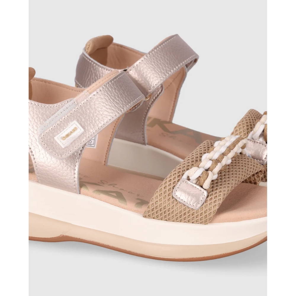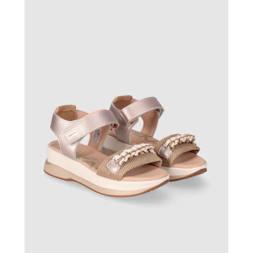 Sandalias de plataforma con mezcla de piel efecto grano y tejido transpirable. Incorporan detalle trenzado en la tira delantera y cierre de velcro para un ajuste sencillo. Ideales para elevar tus looks con confort y estilo casual.