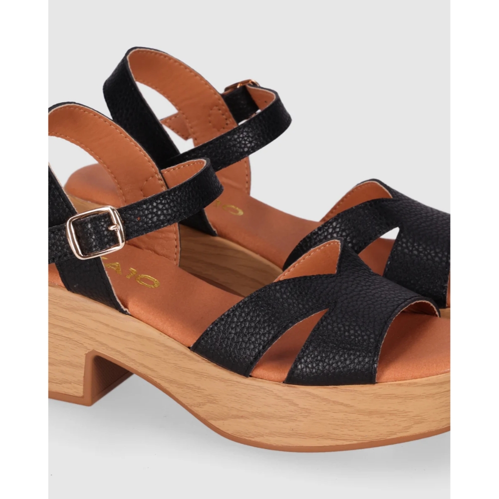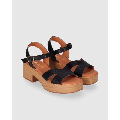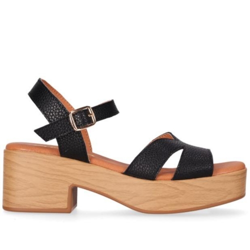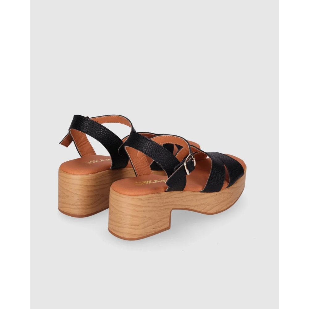 Sandalia de piel con plataforma efecto madera y tacón ancho que suma altura con una pisada estable. Sus tiras cruzadas y la pulsera con hebilla ajustable recogen el pie y estilizan el empeine. Póntelas y descubre que ganar centímetros también puede ser sinónimo de puro confort.