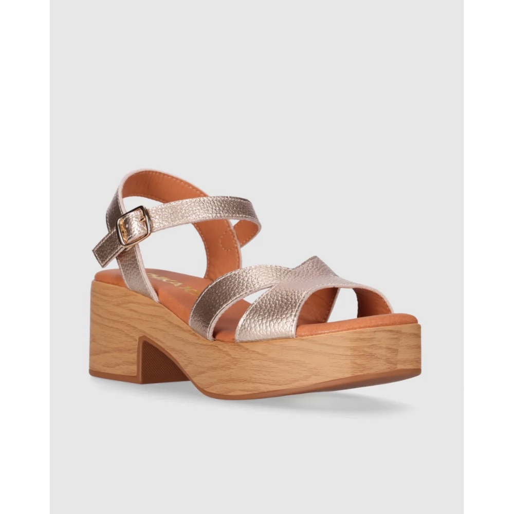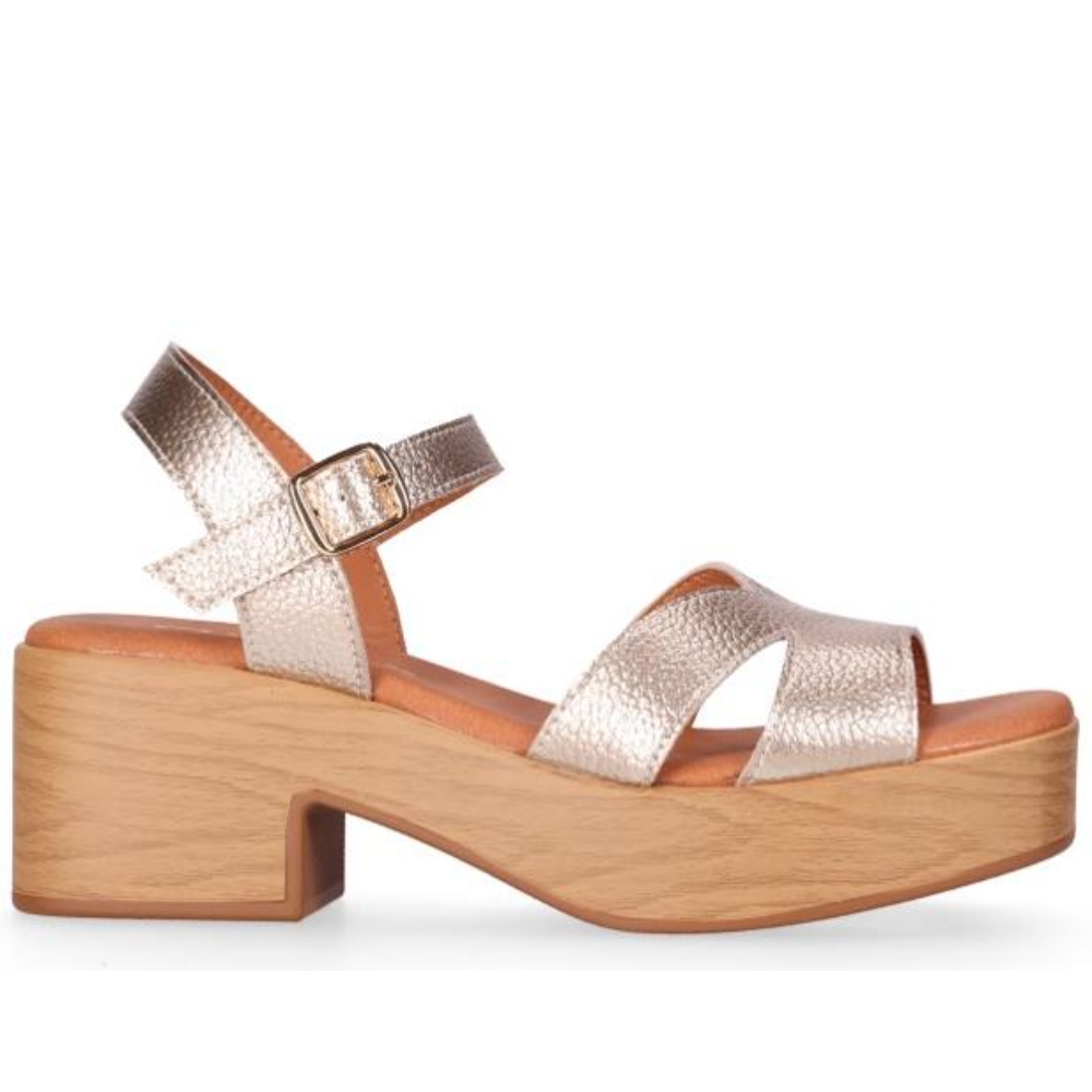 Sandalia de piel con plataforma efecto madera y tacón ancho que suma altura con una pisada estable. Sus tiras cruzadas y la pulsera con hebilla ajustable recogen el pie y estilizan el empeine. Póntelas y descubre que ganar centímetros también puede ser sinónimo de puro confort.