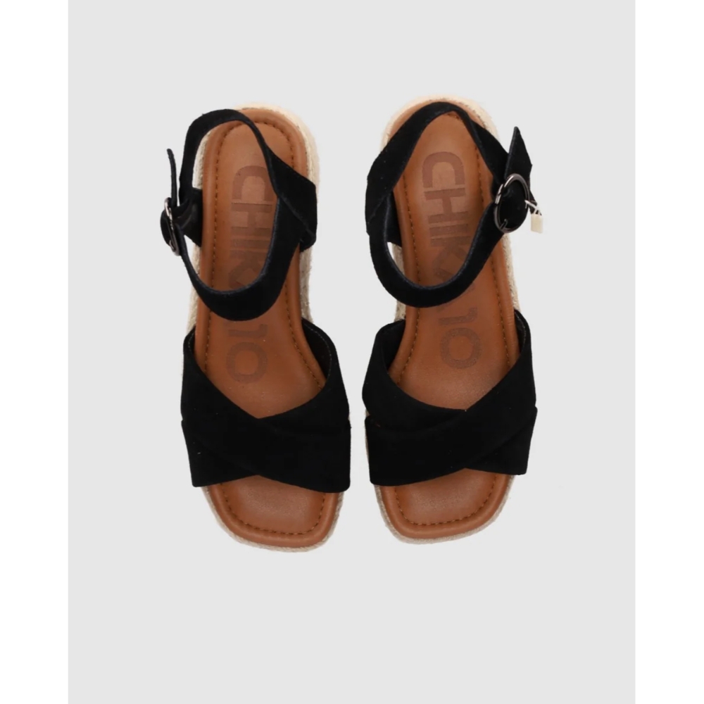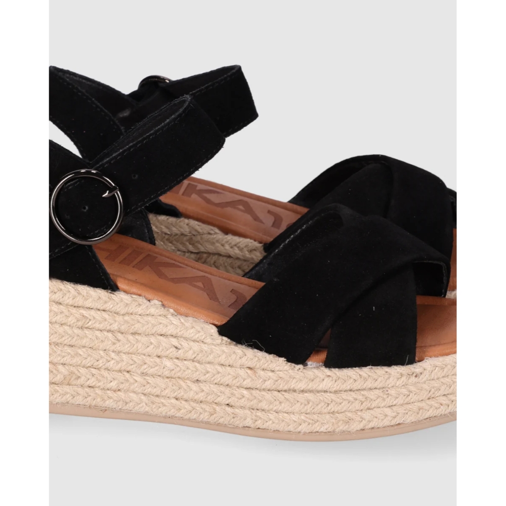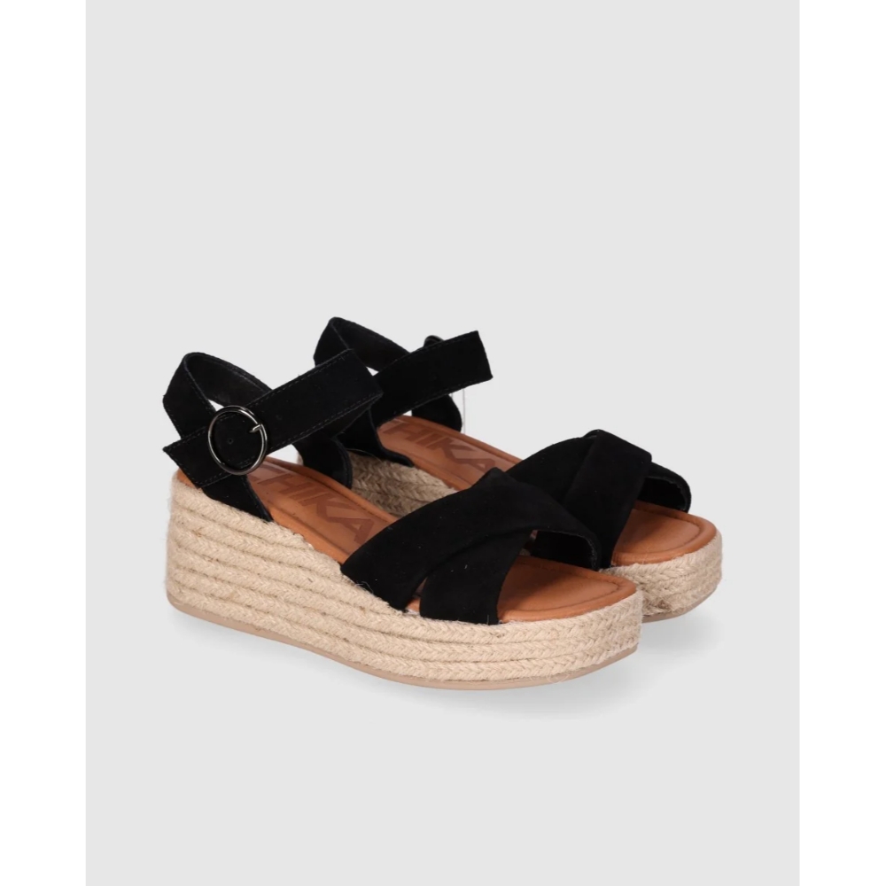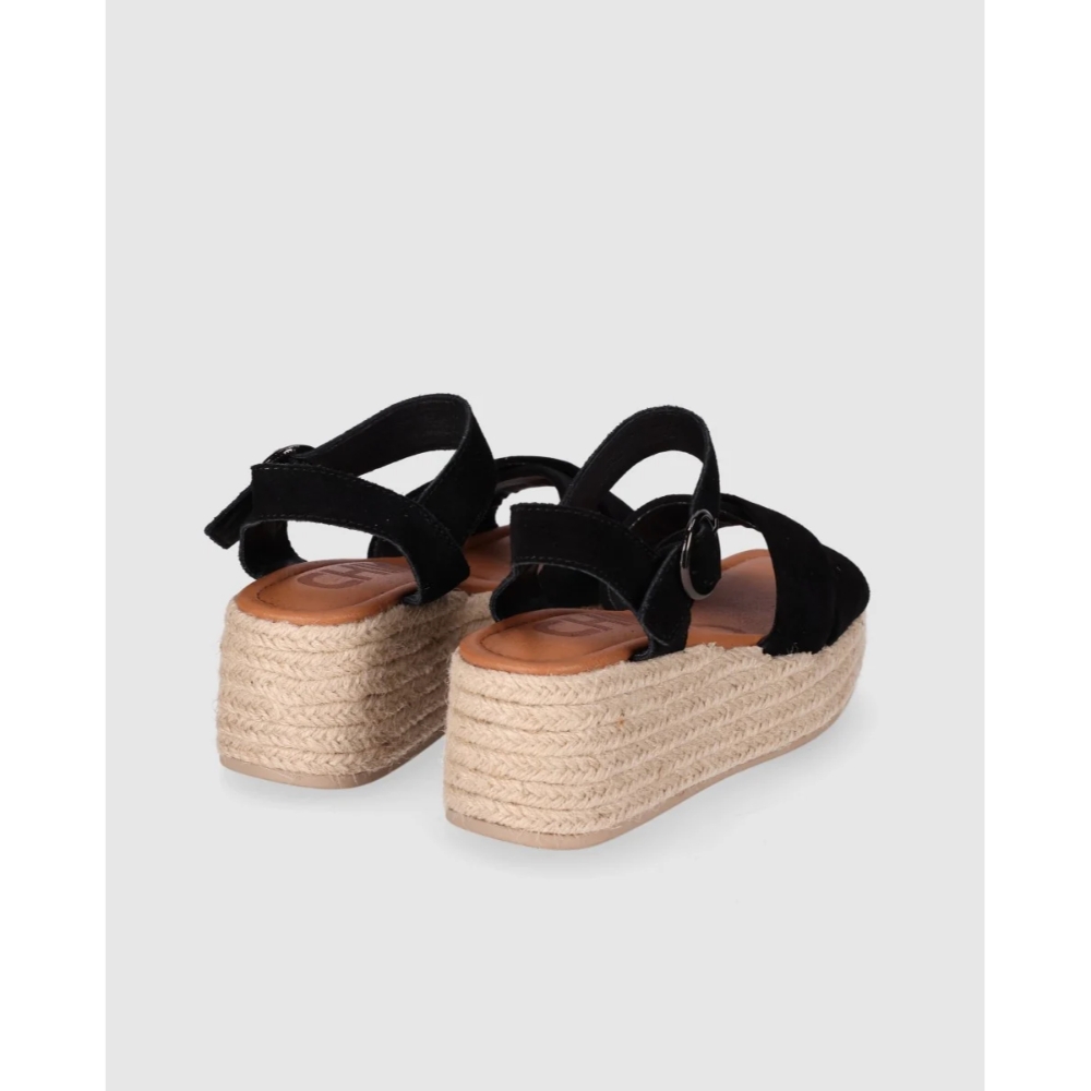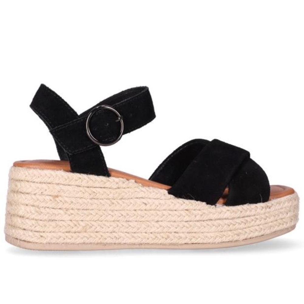 Sandalia de cuña con plataforma de yute trenzado y tiras anchas cruzadas que recogen el pie con suavidad. Pulsera al tobillo con gran hebilla redonda y planta acolchada para acompañarte cómoda todo el día. Súbete a ellas y que la altura la pongan tus sandalias y no tus horarios.