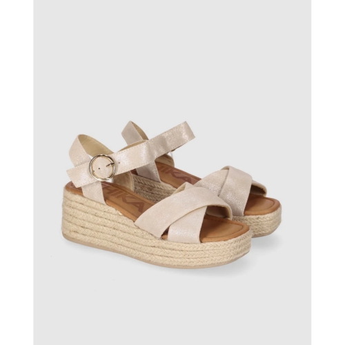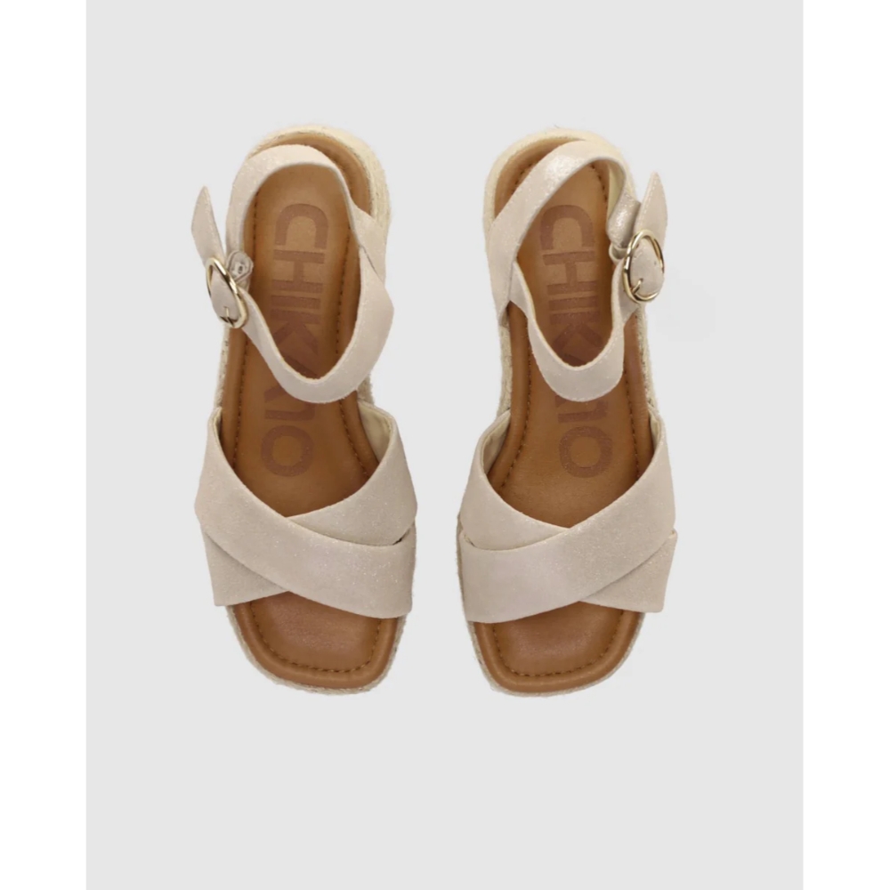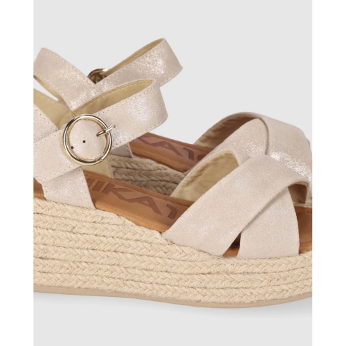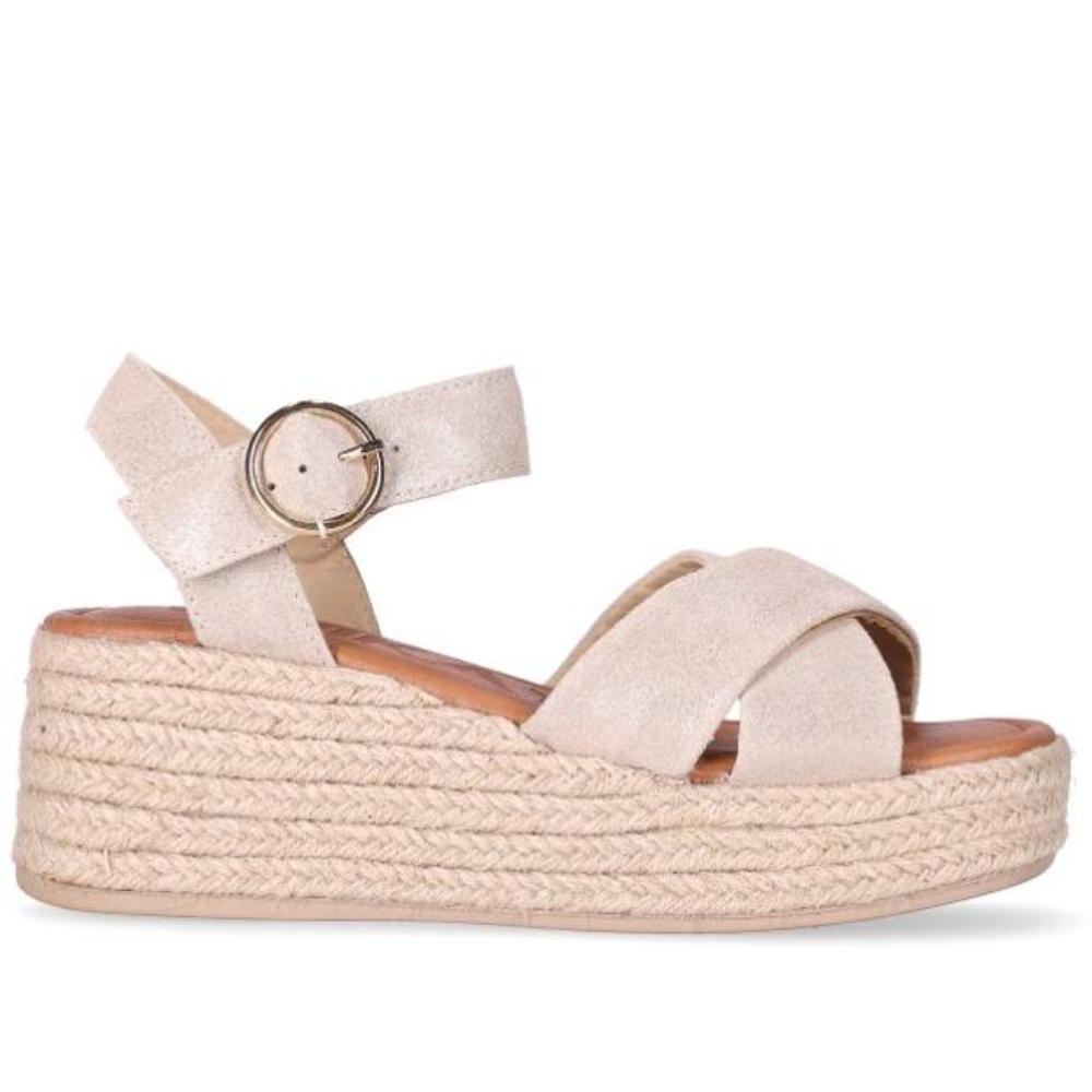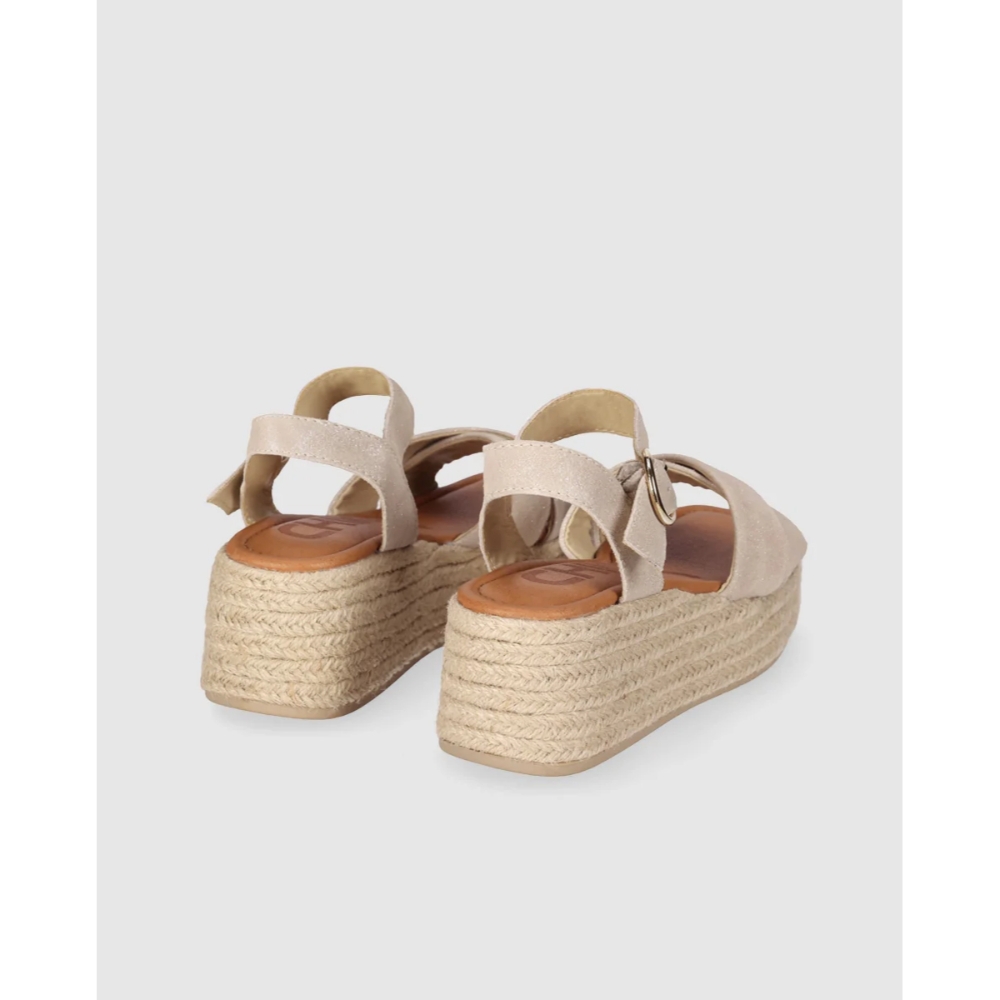 Sandalia de cuña con plataforma de yute trenzado y tiras anchas cruzadas que recogen el pie con suavidad. Pulsera al tobillo con gran hebilla redonda y planta acolchada para acompañarte cómoda todo el día. Súbete a ellas y que la altura la pongan tus sandalias y no tus horarios.