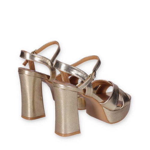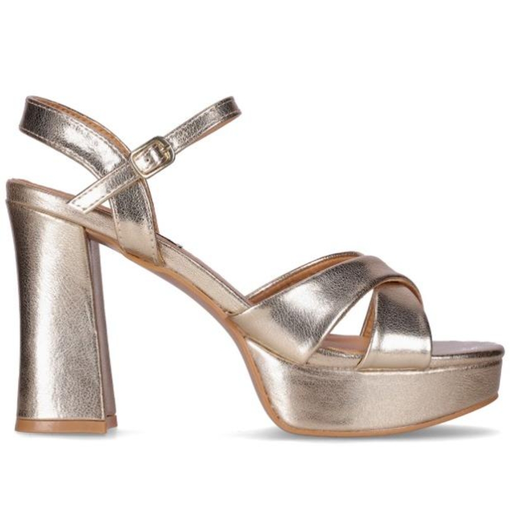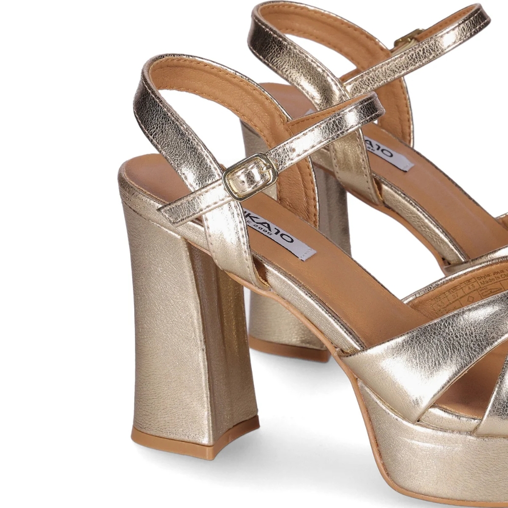 Sandalia de plataforma con tacón grueso, confeccionada en lujoso material efecto metalizado para un estilo excepcional. Con tiras cruzadas y pulsera al tobillo con hebilla, ofrece estabilidad y seguridad. Eleva tu estilo con cada paso.