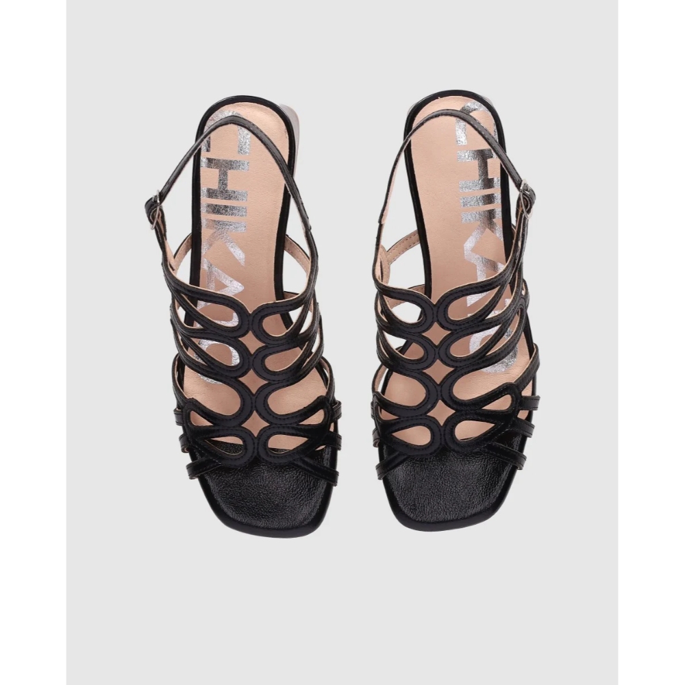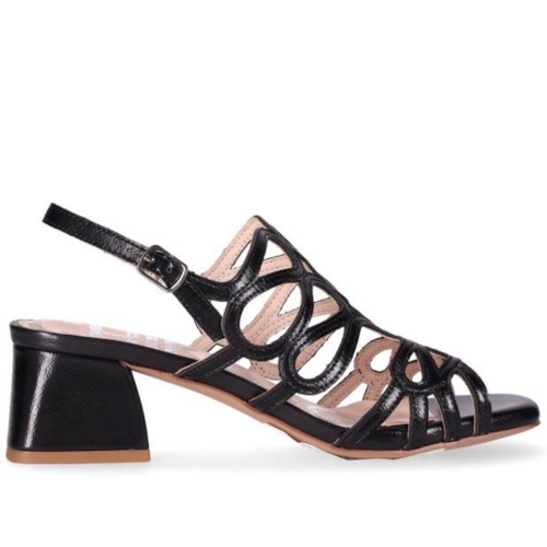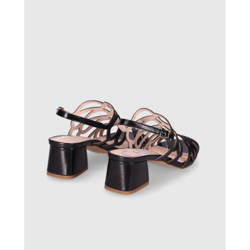 Sandalias de tacón medio con diseño calado que aporta ligereza y elegancia. Destacan sus tiras entrelazadas y el cierre de hebilla al tobillo que asegura un ajuste cómodo. Perfectas para completar tus looks más sofisticados sin renunciar a la comodidad.