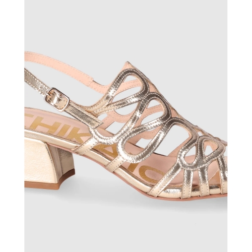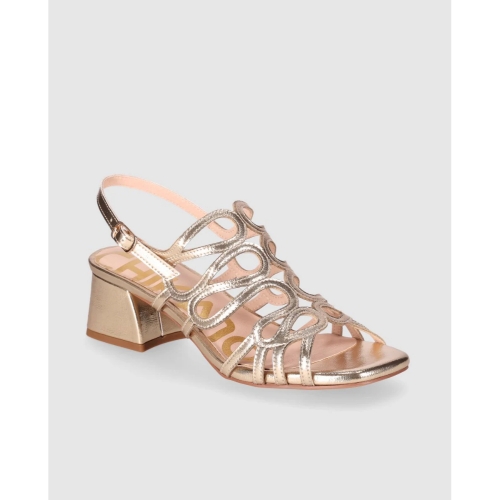 Sandalias de tacón medio con diseño calado que aporta ligereza y elegancia. Destacan sus tiras entrelazadas y el cierre de hebilla al tobillo que asegura un ajuste cómodo. Perfectas para completar tus looks más sofisticados sin renunciar a la comodidad.