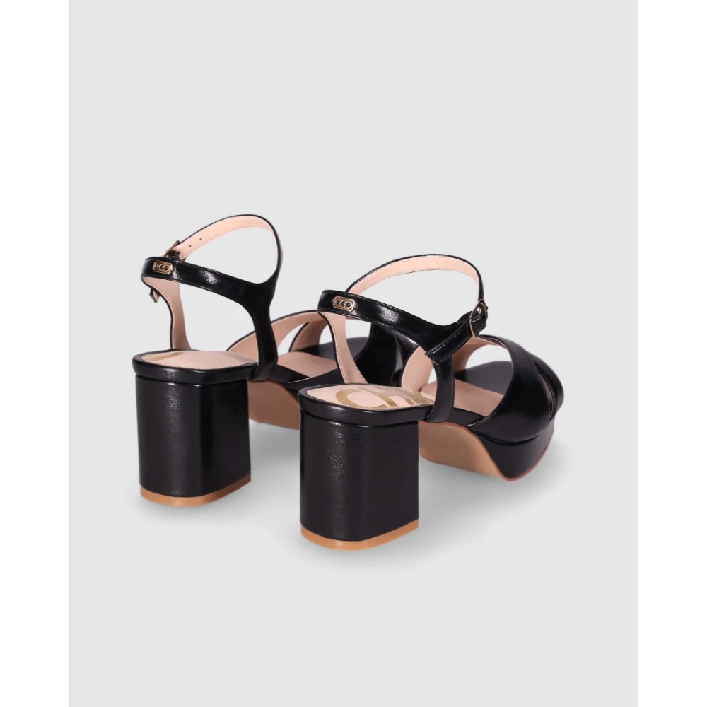 Sandalias de tacón ancho con plataforma delantera que aporta altura sin perder estabilidad. Destacan sus tiras cruzadas en la pala y el cierre de hebilla al tobillo que asegura un ajuste perfecto. Ideales para brillar con estilo en tus ocasiones especiales.