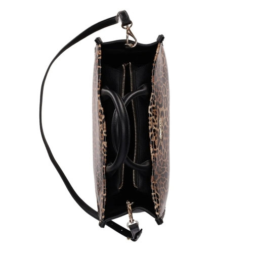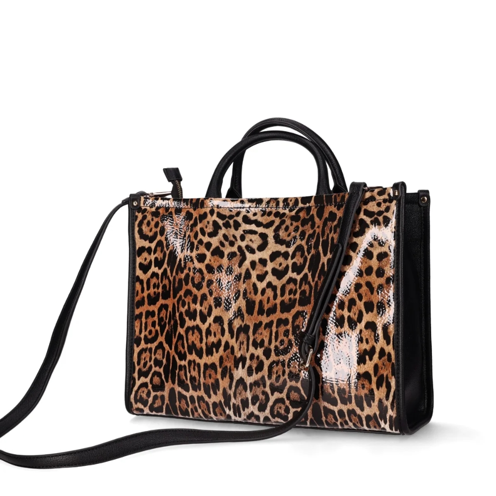 Bolso con Estilo de Animal Print: Este bolso presenta un diseño llamativo con estampado de animal print y detalles lisos en las asas y la correa. Incluye un cierre superior de cremallera y espacio interior amplio, ideal para añadir un toque atrevido y moderno a cualquier look.