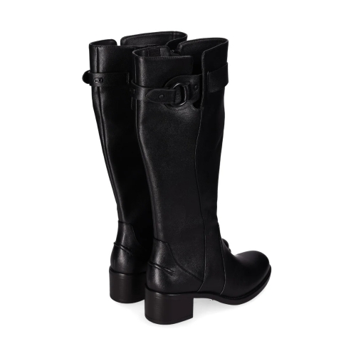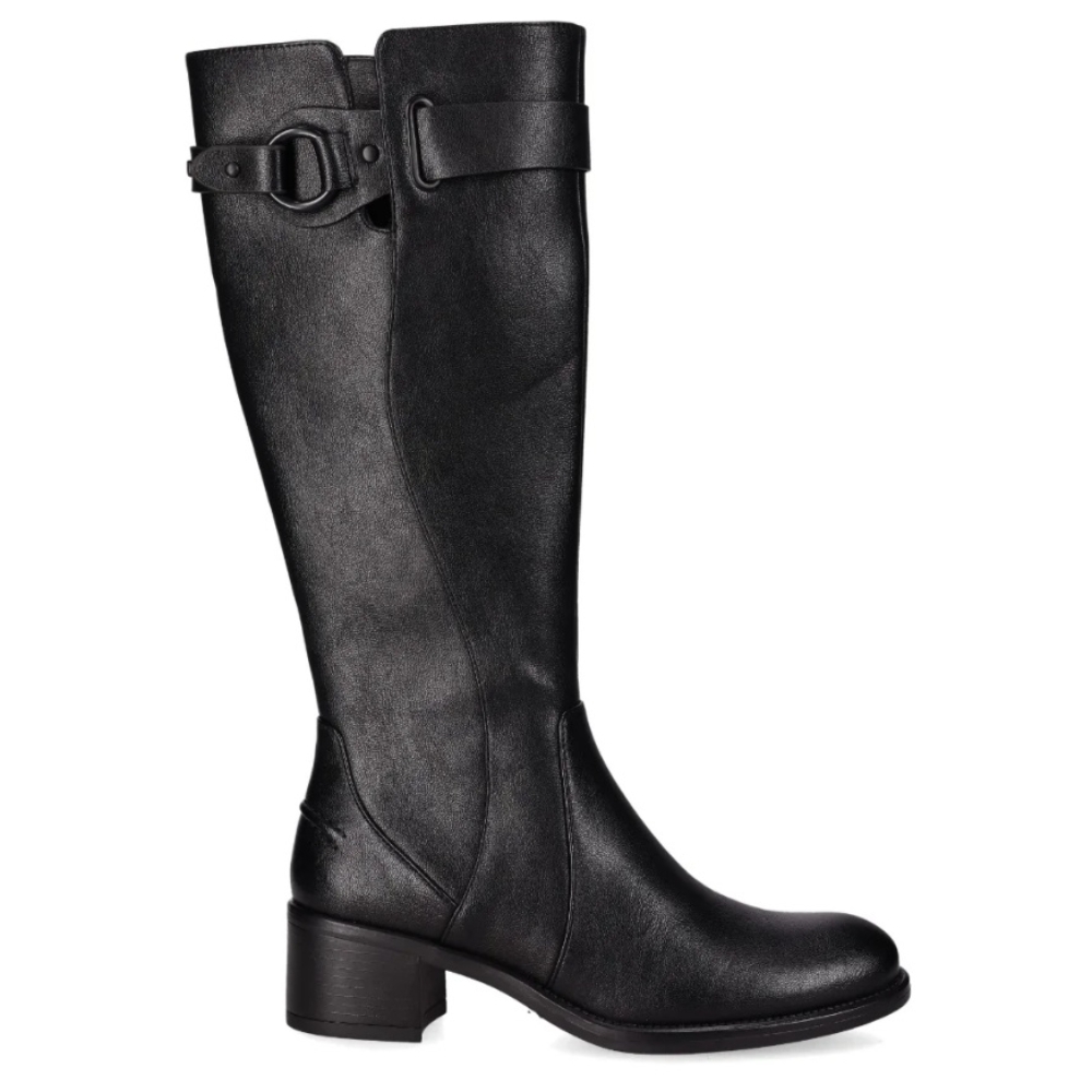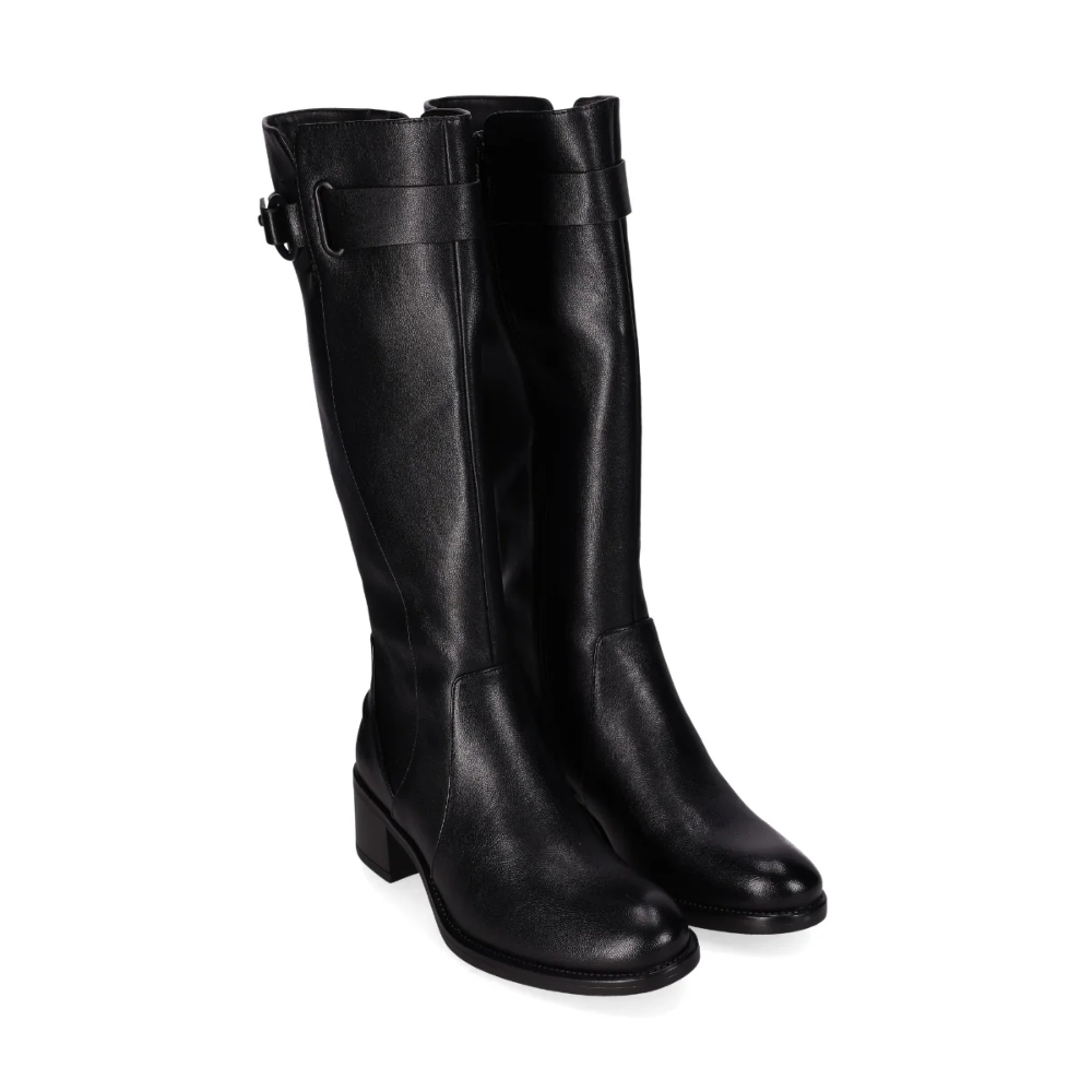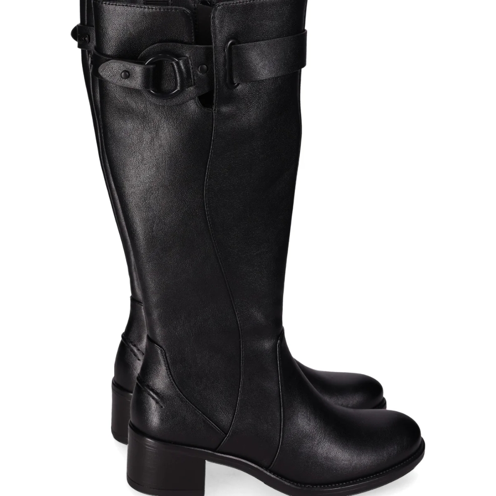 Botas de tacón medio con hebilla decorativa. Con caña alta, presentan un elegante acabado en piel vegana suave y un detalle de hebilla decorativa en su caña. Su cierre en cremallera lateral y su diseño sofisticado las hace perfectas para ocasiones casuales y looks formales. ¡Combina elegancia y confort en cada paso!