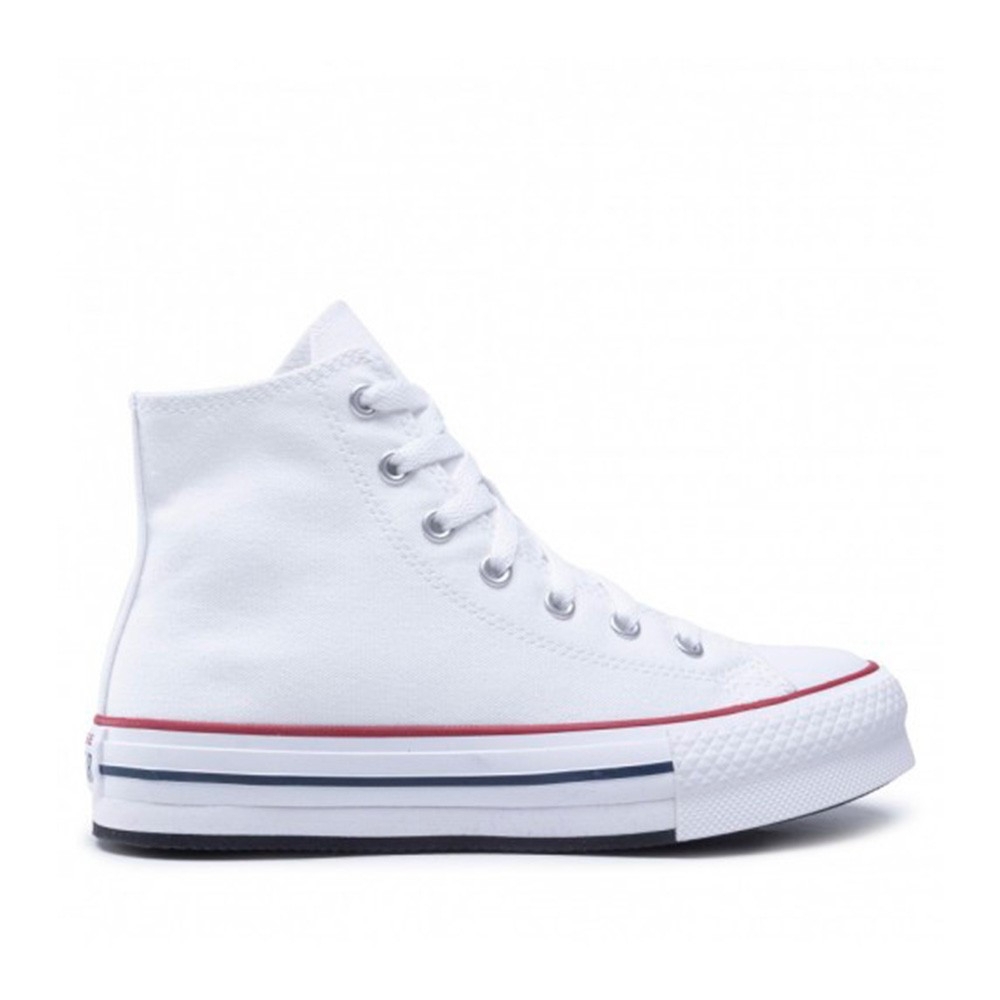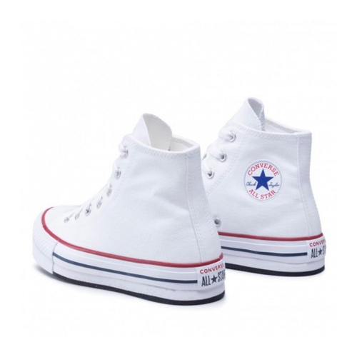 Botín Converse All Star en color blanco con detalles en marino y rojo. Fabricado en lona. Con cierre de cordón plano. Piso de goma con plataforma, con suela de de caucho vulcanizado. Plantilla SmartFOAM para ofrecer sujeción y comodidad todo el día. Altura plataforma 3 cm. Color blanco, con suela blanca.