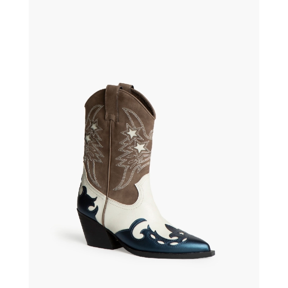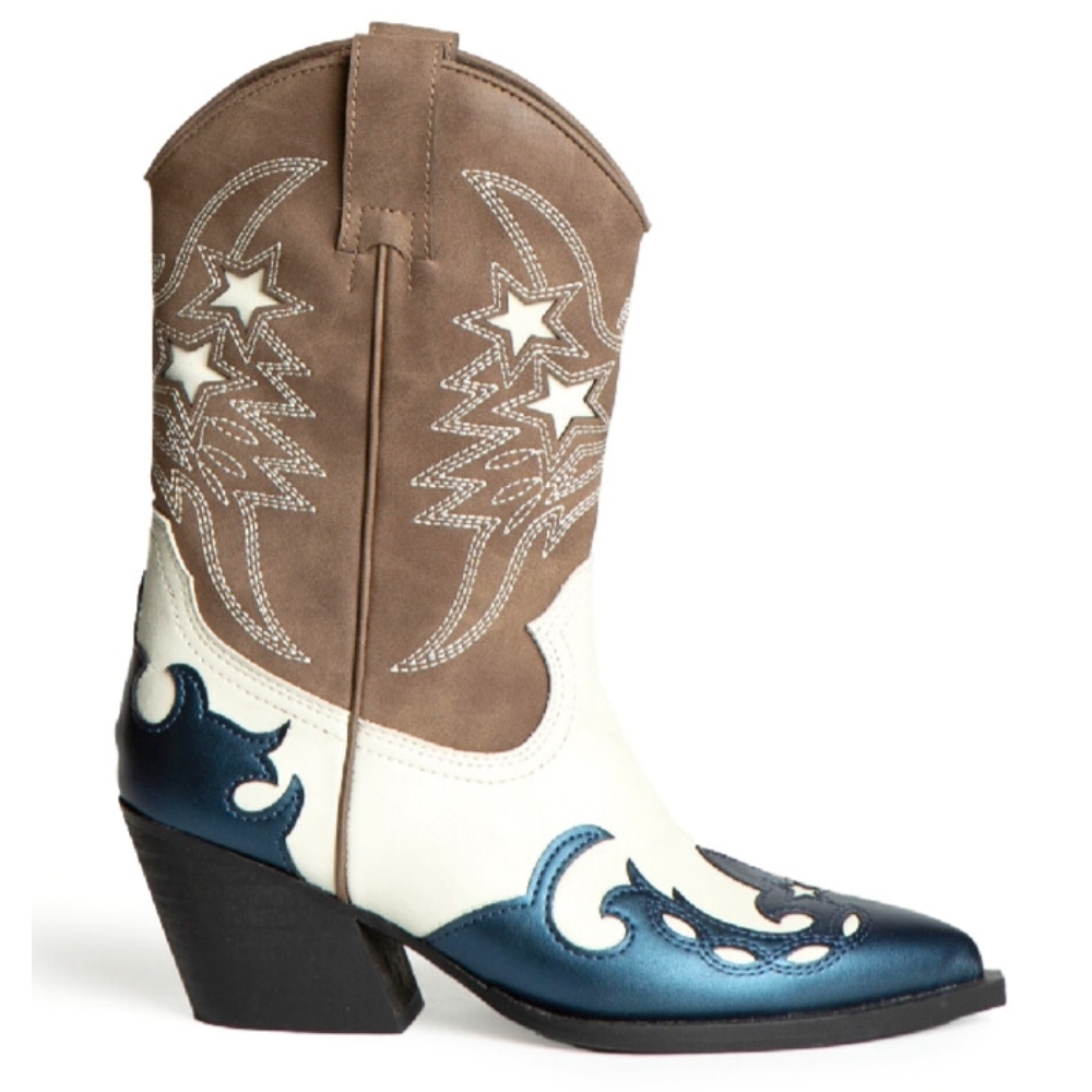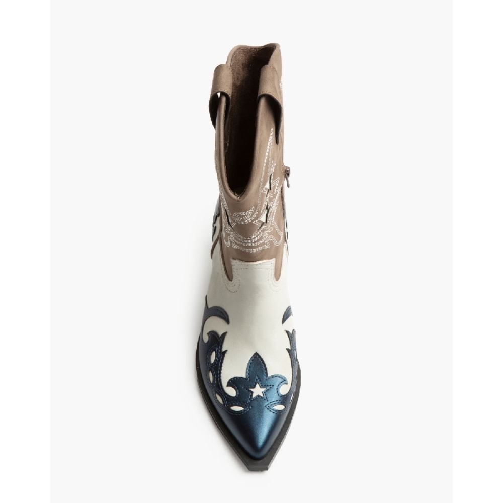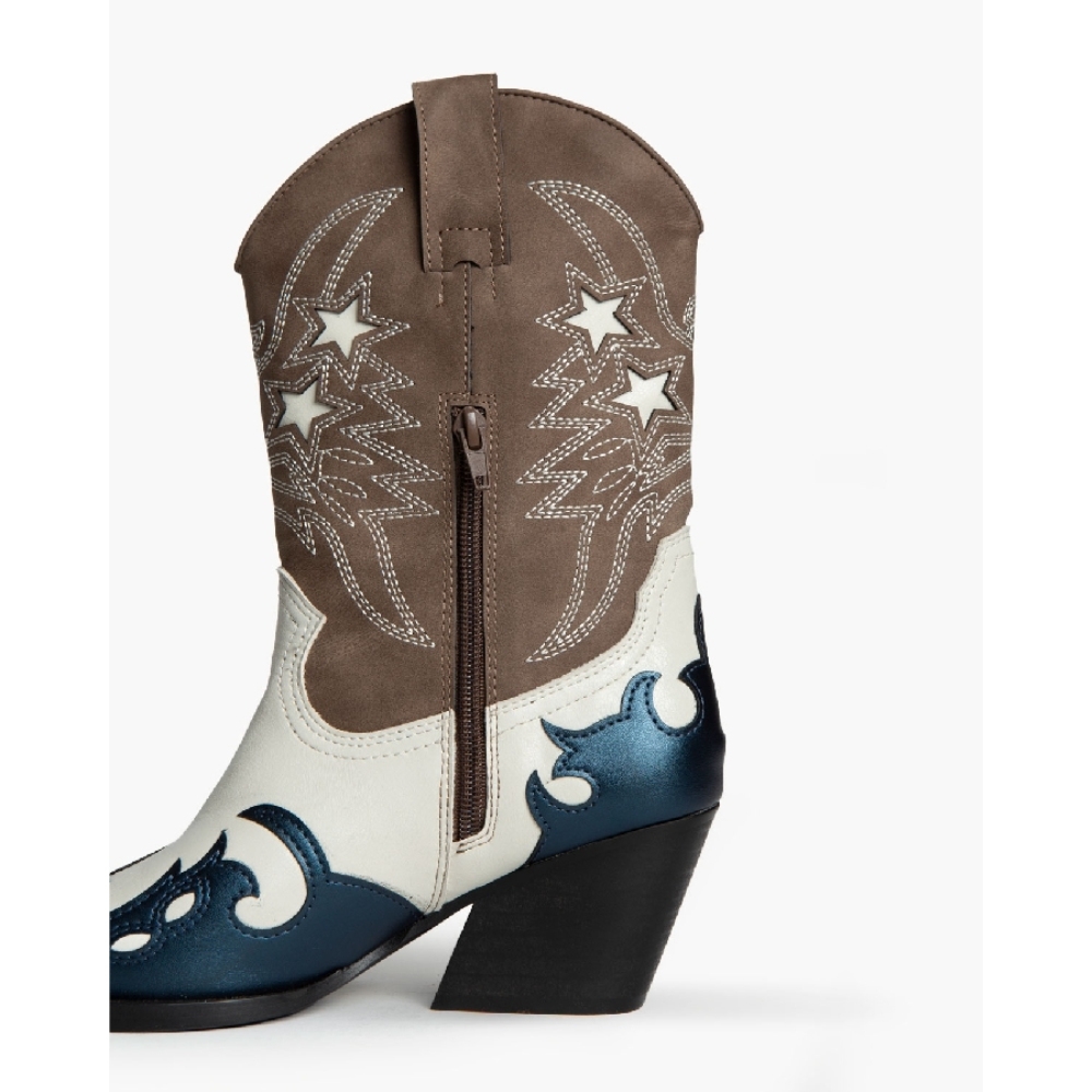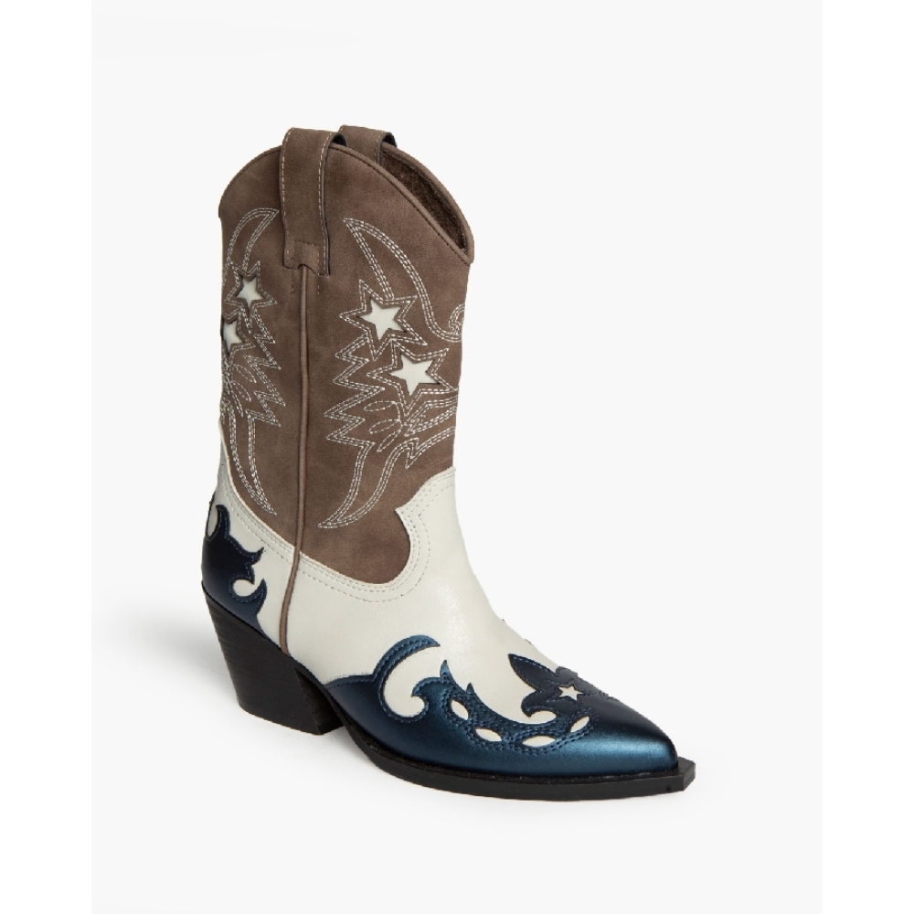 Botín estilo cowboy. Tiradores en los laterales. Acabado en punta. Corte en mezcla de materiales y colores. Cremallera en el lateral interior.
