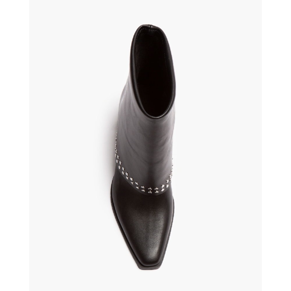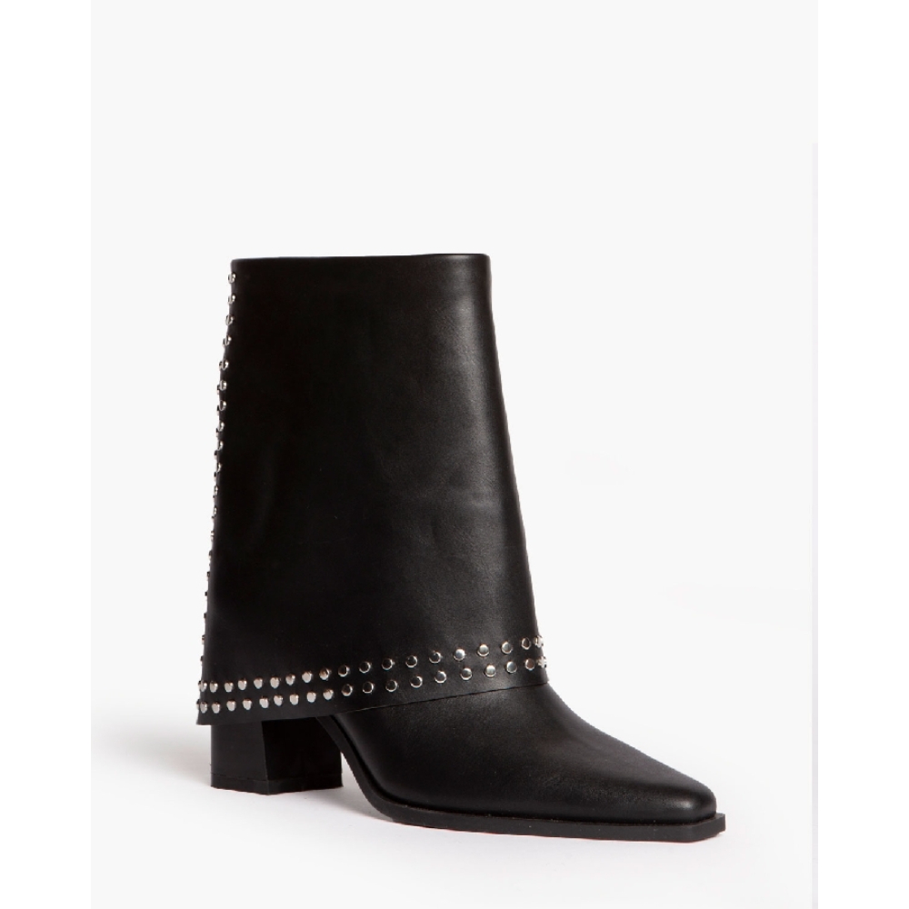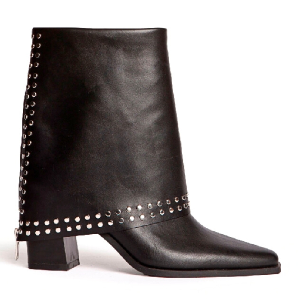 Botín estilo cowboy. Detalle de polaina con tachas y cremallera trasera. Acabado en punta. Cremallera en el lateral interior.