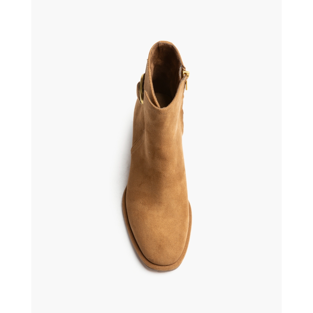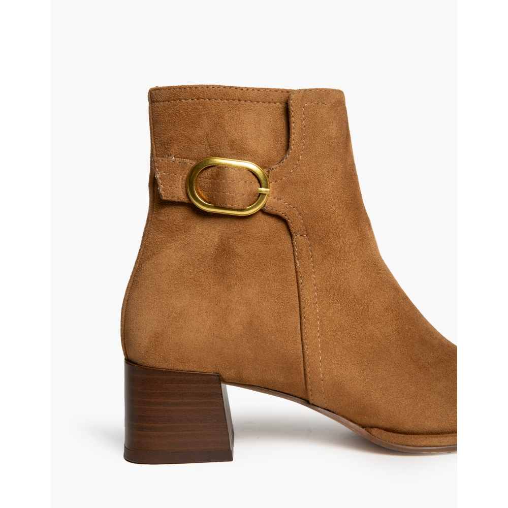 Botín de tacón medio. Detalle de hebilla en la parte superior de la caña. Cremallera en la parte lateral interior. Tacón acho. Acabado en punta.