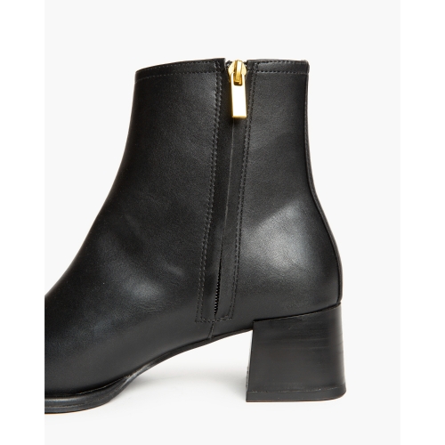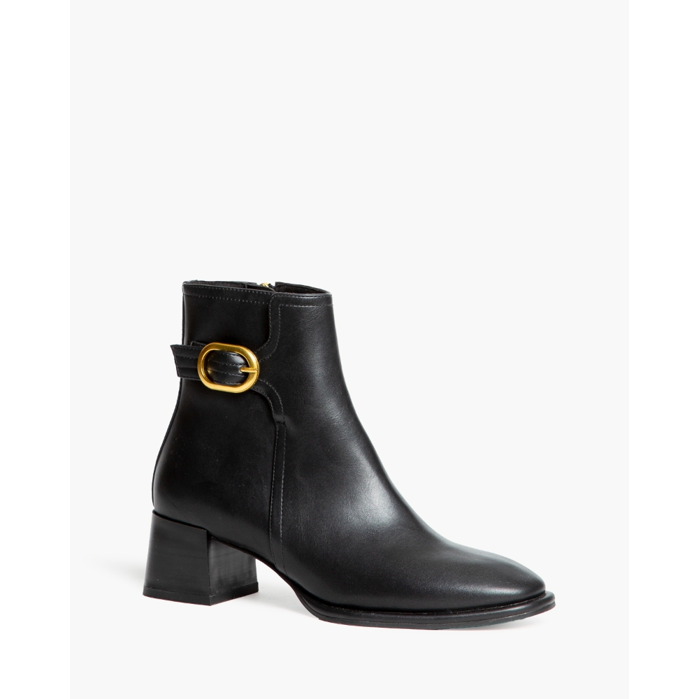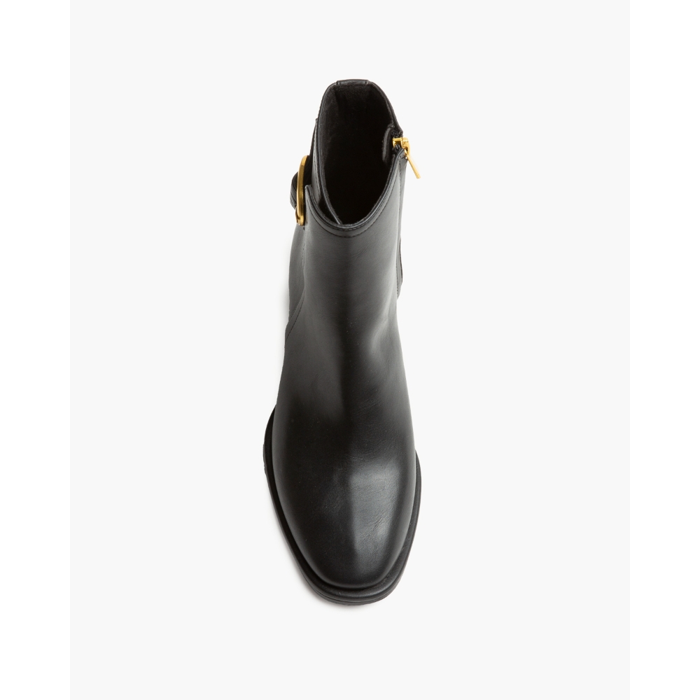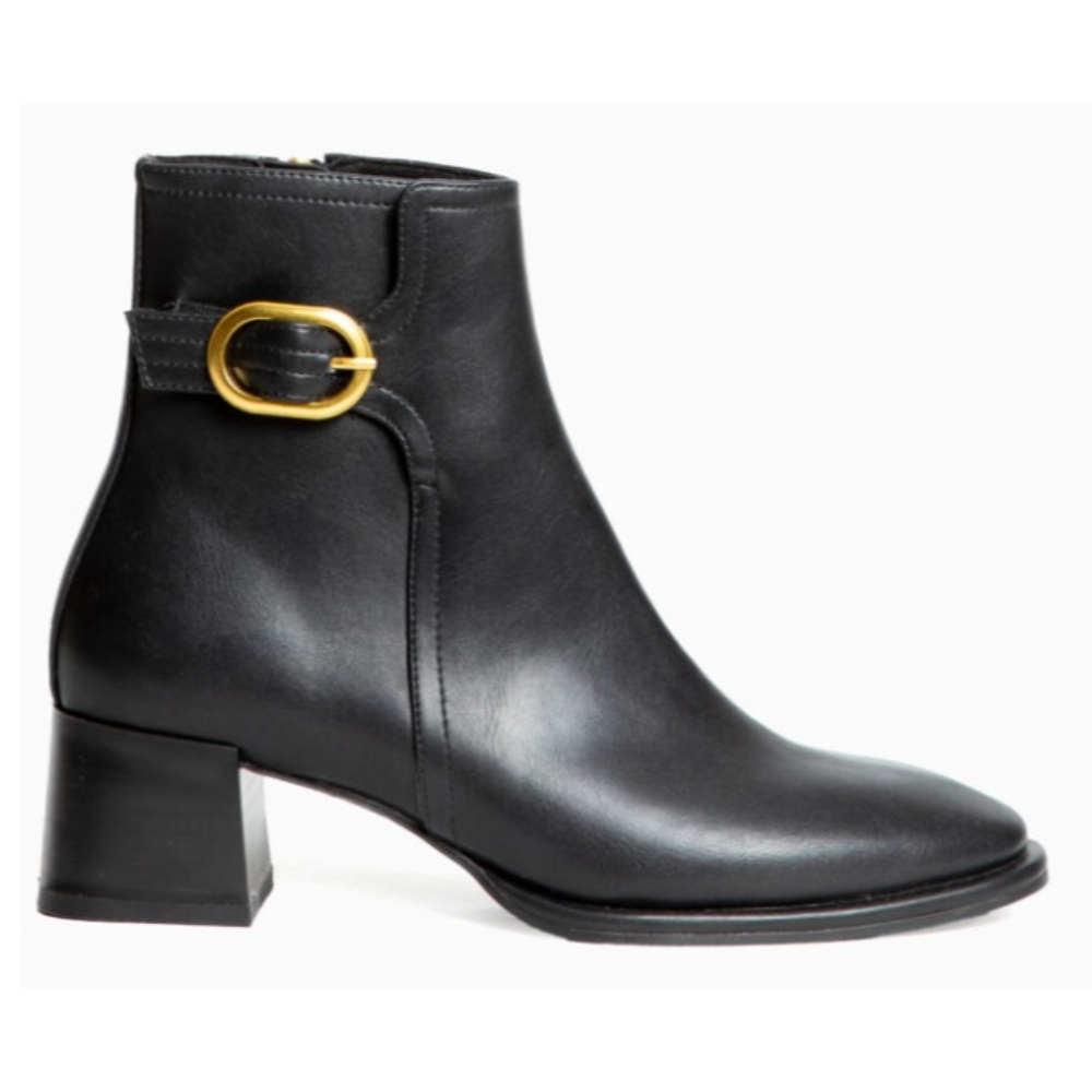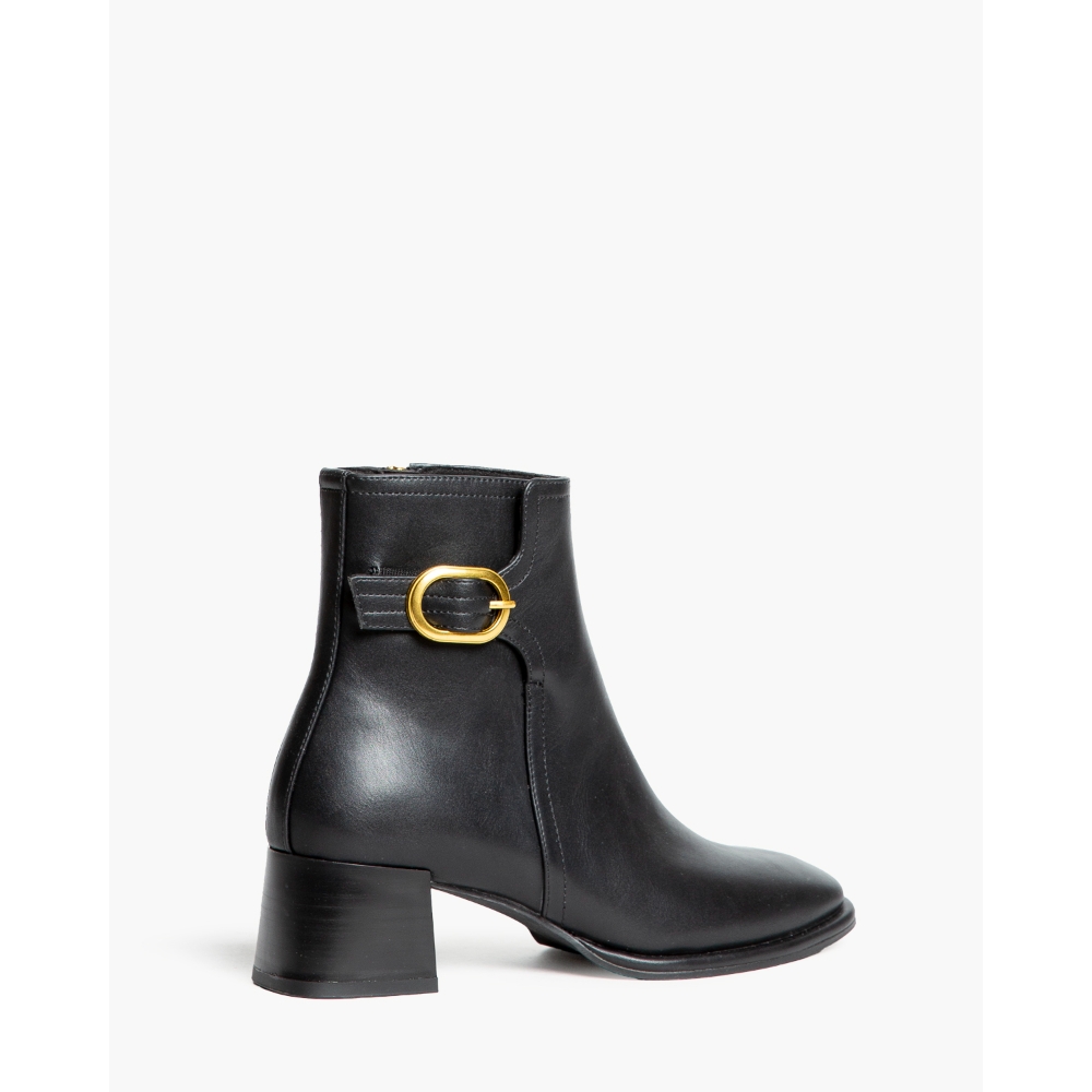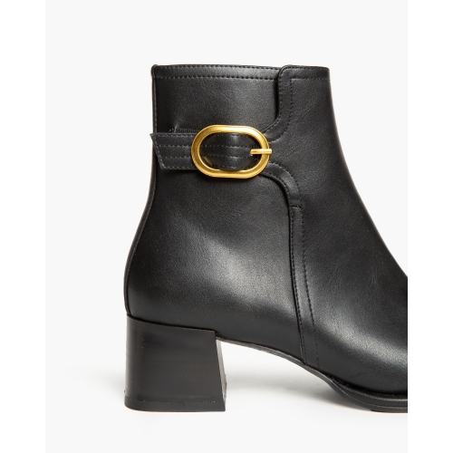 Botín de tacón medio. Detalle de hebilla en la parte superior de la caña. Cremallera en la parte lateral interior. Tacón acho. Acabado en punta.