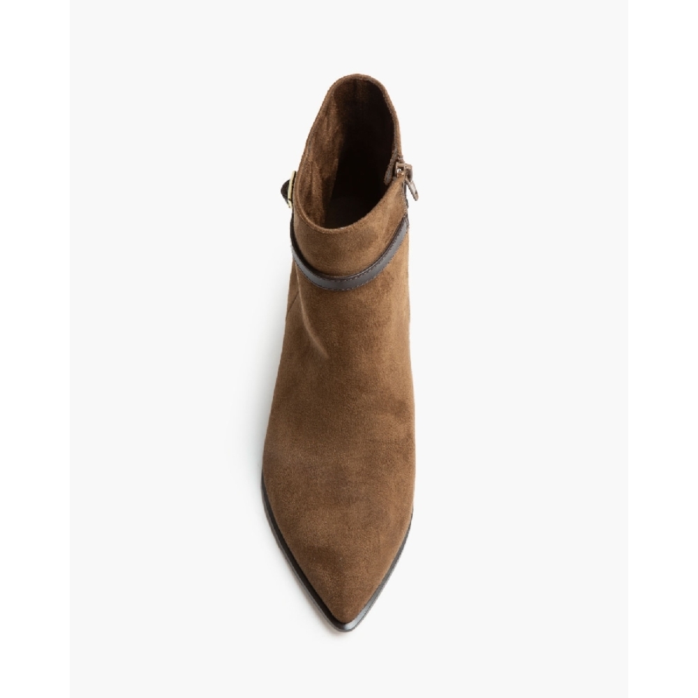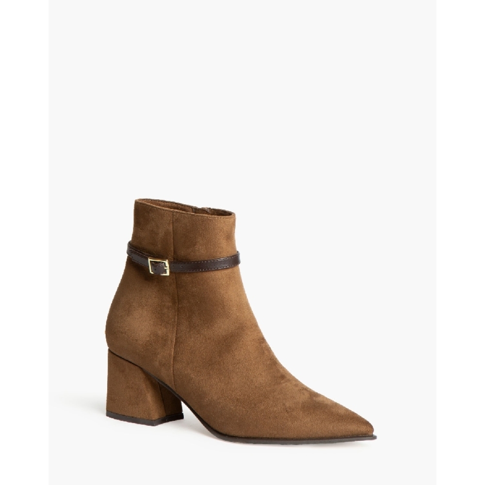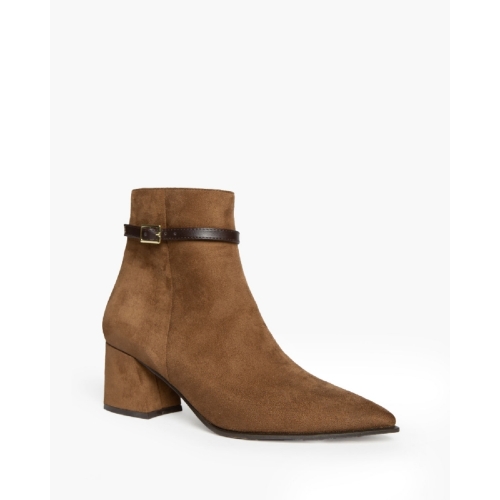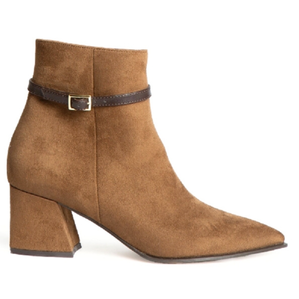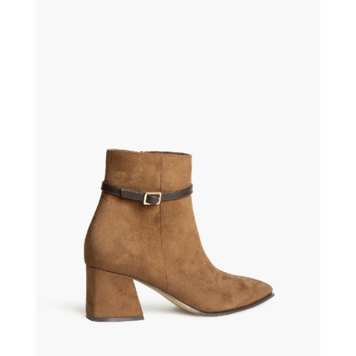 Botín de tacón medio. Detalle de tira fina con hebilla en la parte superior de la caña. Cremallera en la parte lateral interior. Tacón acho.