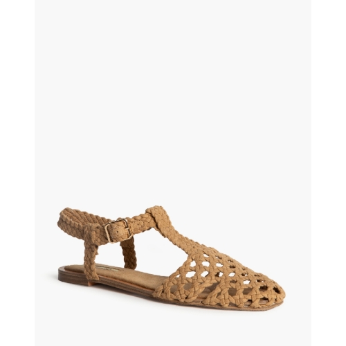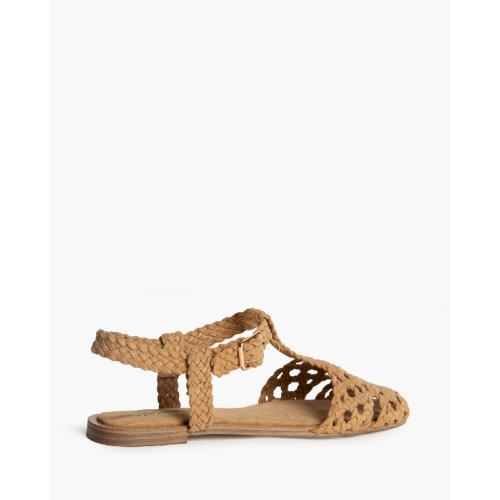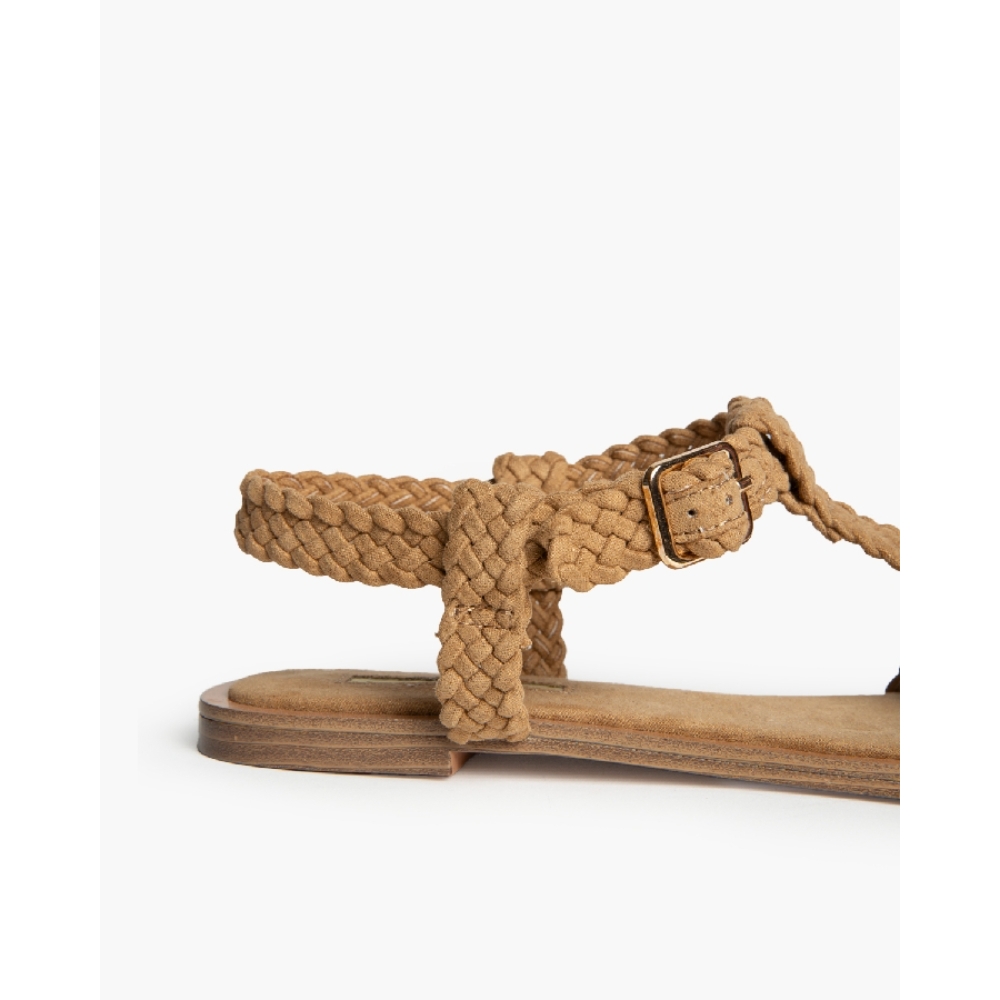 Sandalia plana tipo cangrejera. Cierre mediante hebilla al tobillo. Corte trenzado.Altura de la suela 1 cm.