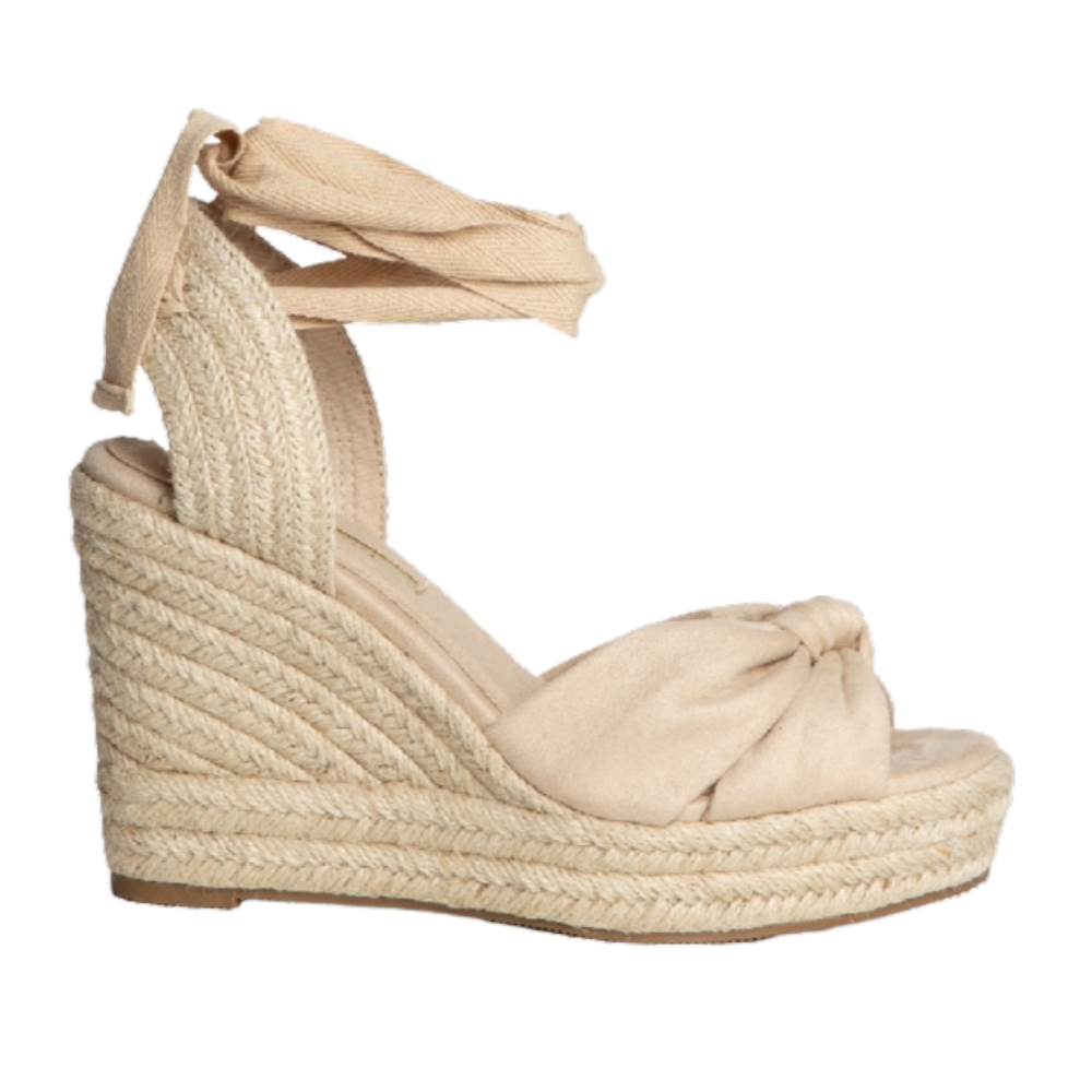Sandalia de plataforma, con cuña en yute. Cierre hebilla en la tira del talón. Detalle de nudo en la parte delantera.Altura del tacón 10 cm.Altura de la plataforma 3 cm.
