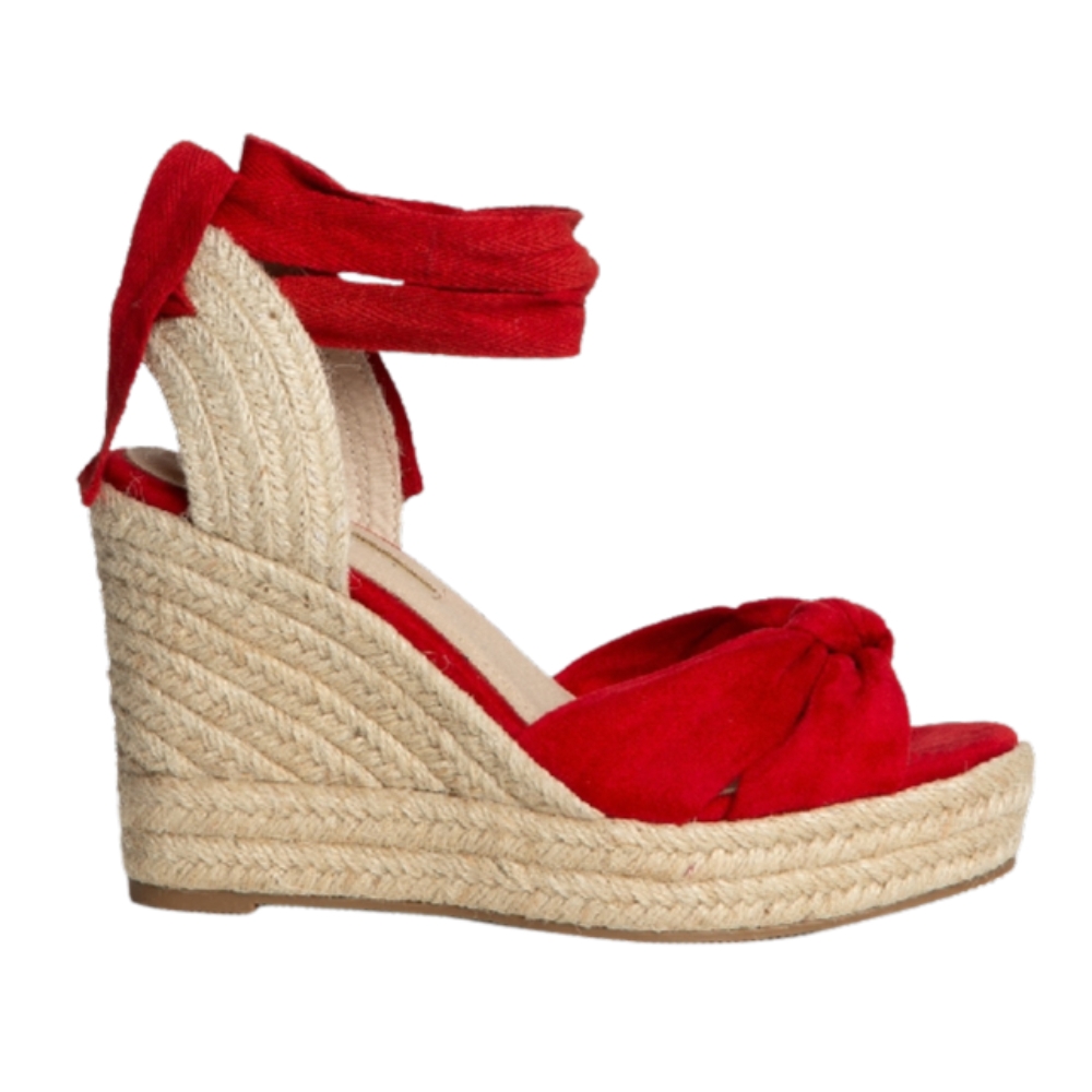 Sandalia de plataforma, con cuña en yute. Cierre hebilla en la tira del talón. Detalle de nudo en la parte delantera.Altura del tacón 10 cm.Altura de la plataforma 3 cm.
