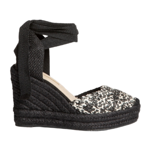 Plataforma tipo valenciana, con cuña en yute. Corte en trenzado bico-lor. Cierre mediante tiras anudadas al tobillo.Altura del tacón 10 cm.Altura de la plataforma 3 cm.